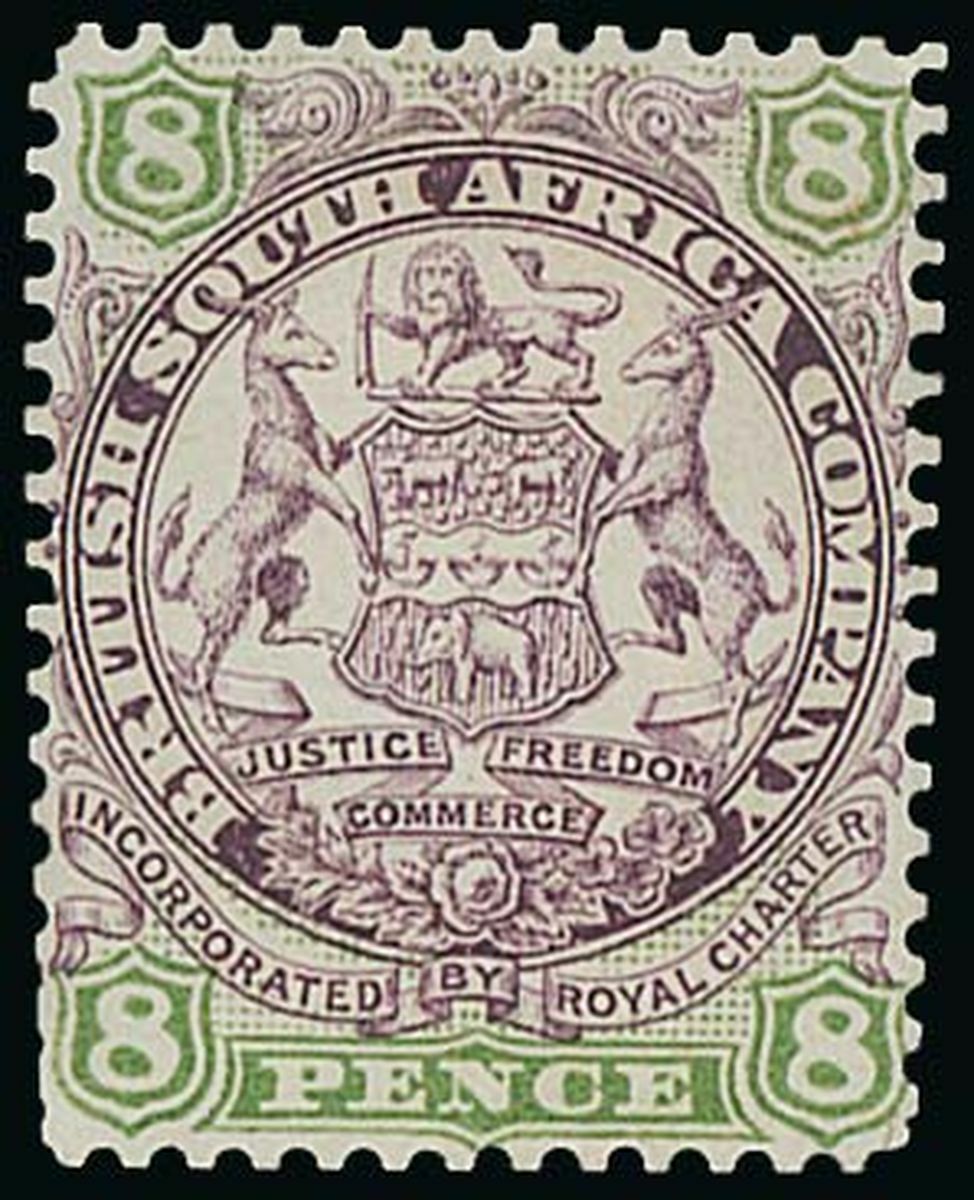 8d. colour trial of the unadopted die in green and purple, on gummed paper; fine.  Photo