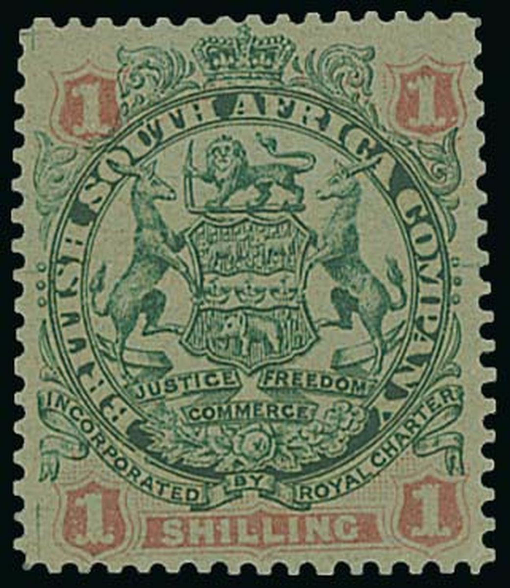 1/- in red and dark green on green on wove paper without gum; fine. Photo