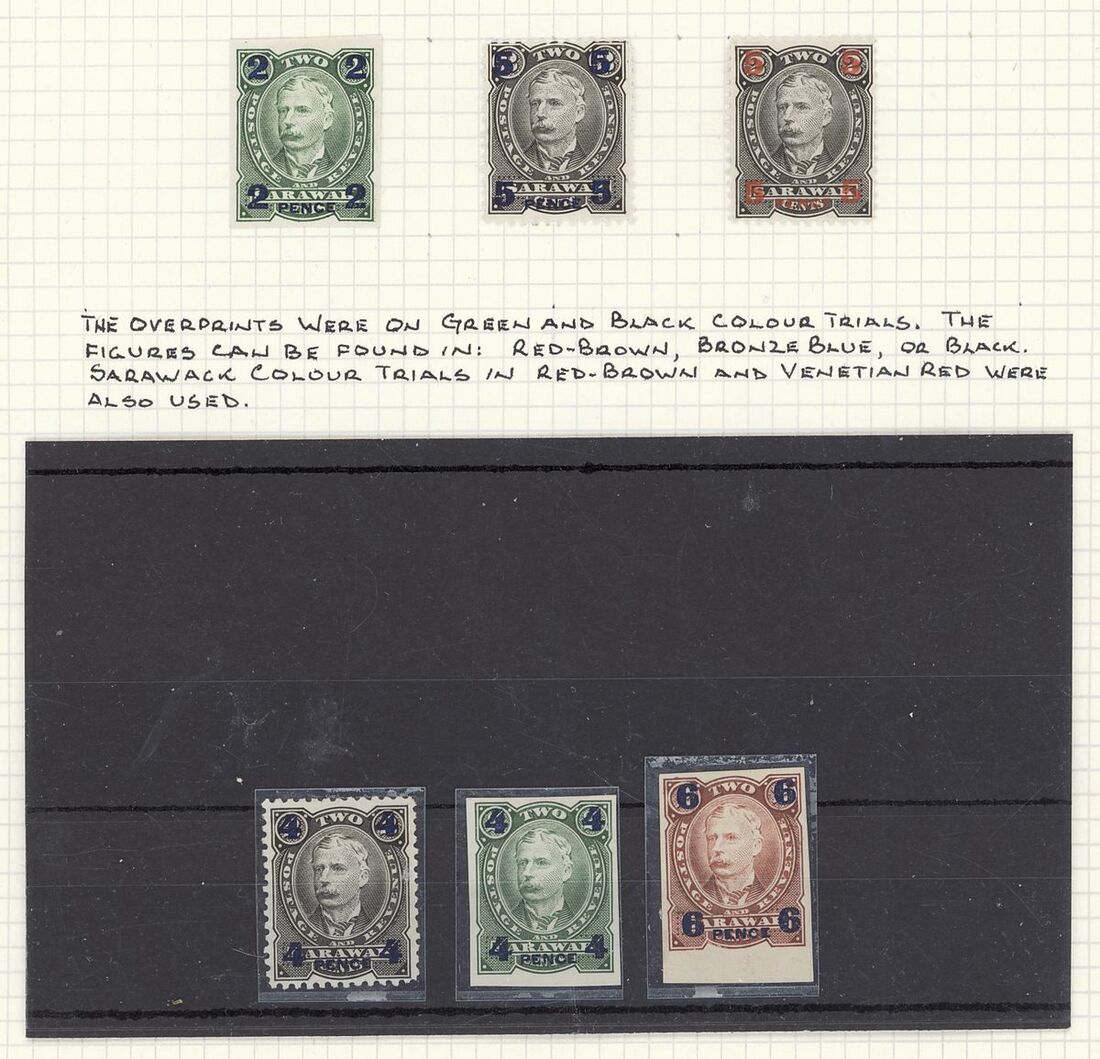 Perkins Bacon Paper Shrinkage Trial essays using Sarawak stamps (6), comprising 2d. on 2c. green, 4d. on 2c. green and 6d. on 2c. brown all imperforate and 4d. on 2c. black, 5d. on 2c. black and 2d. in red on 2c. black perforated, the new values superimposed to test for paper shrinkage.  A scarce group