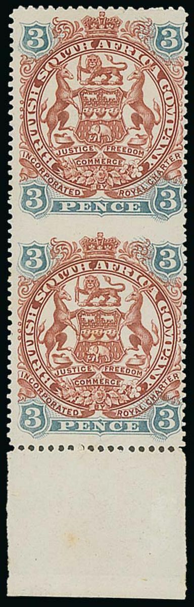 1897 redrawn 3d. brown-red and slate-blue, vertical pair from the foot of the sheet variety imperforate between, large part original gum; fine. S.G. 69a, £4,750. Photo