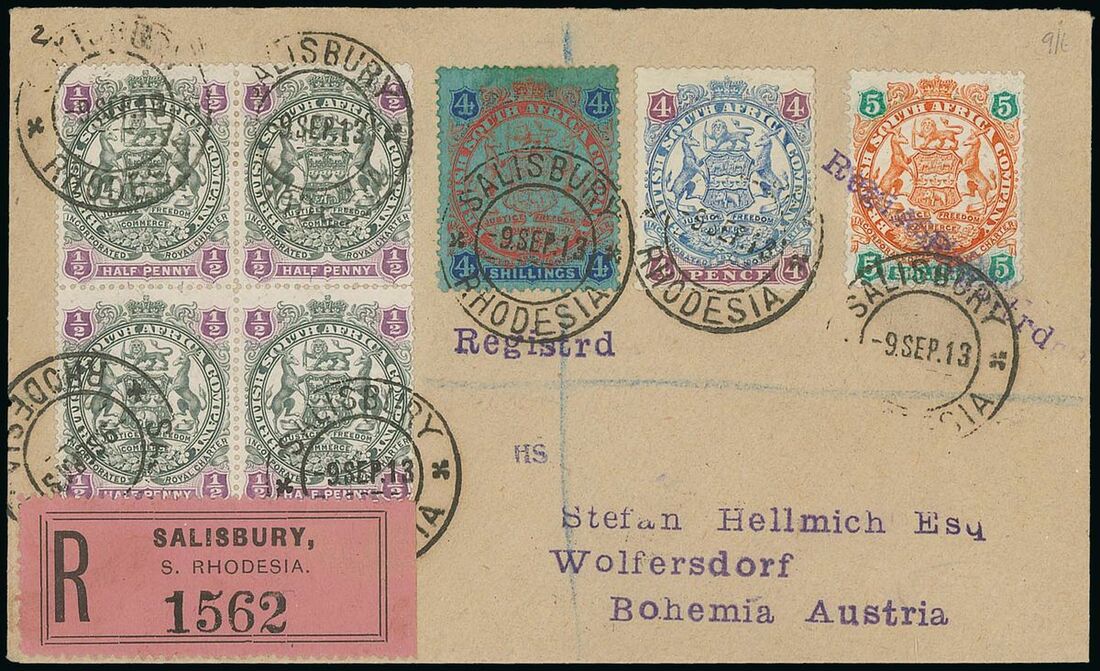 1913 (9 Sept.) Hellmich envelope to Austria bearing Die I 4/- and Die II ½d. block of four, 4d. and 5/- all tied to cover by