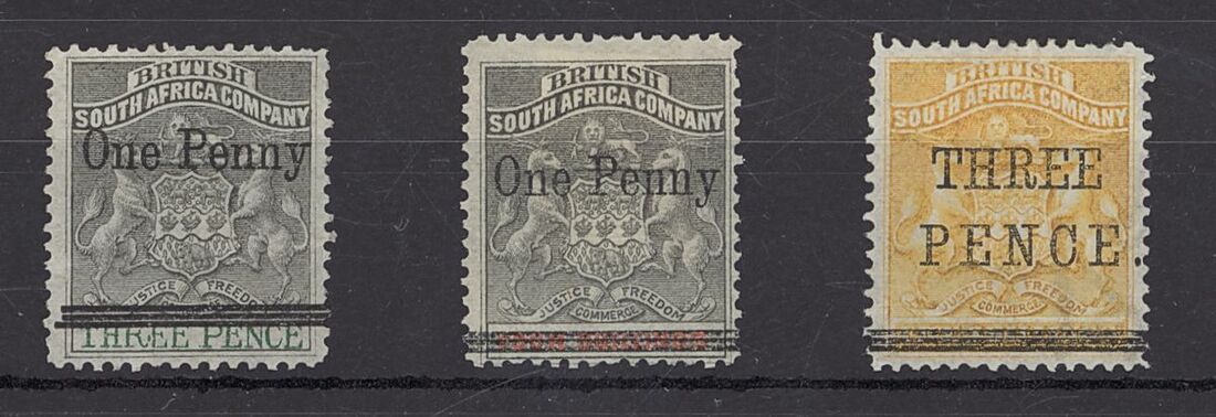 1d. on 3d. and 1d. on 4/- (10mm. between value and upper bar) and 3d. on 5/- mint, the 1d. with horizontal crease, part to large part original gum. S.G. 51-53, £1,200
