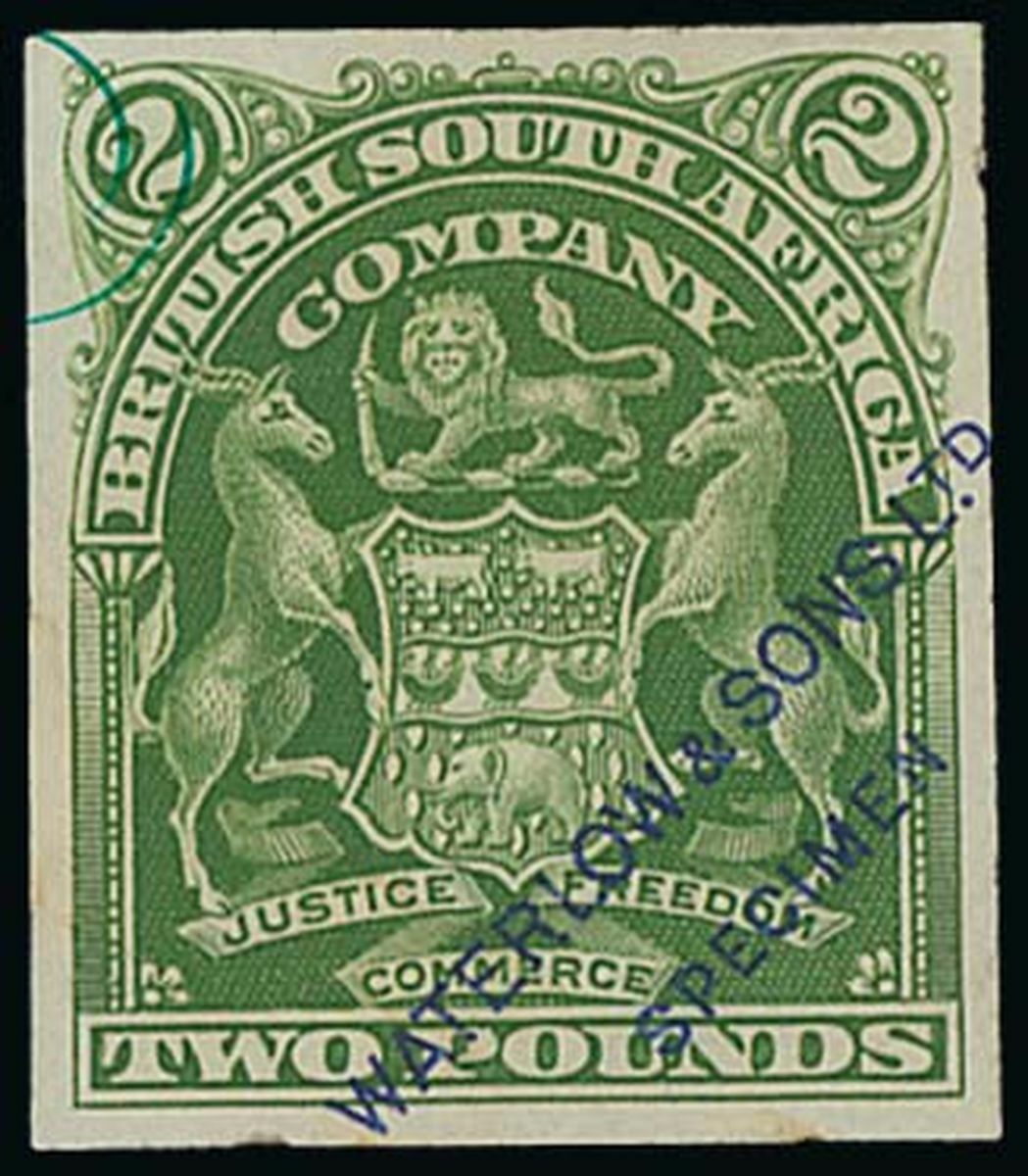 £2 imperforate sample stamp in bright green, handstamped