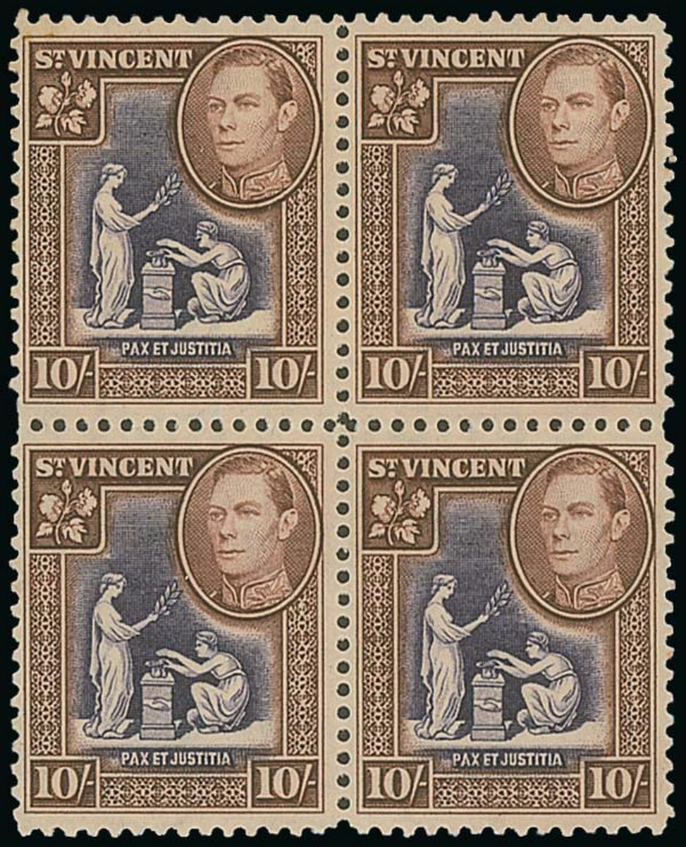 1938-47 Script 10/- violet and brown, block of four, variety watermark inverted, unmounted slightly toned gum; nevertheless a hugely rare multiple. S.G. 158aw, £48,000. Photo