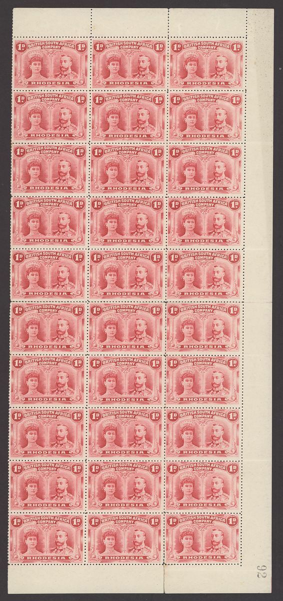 1d. bright carmine, Plate B, block of thirty from the right of the sheet with sheet number '92' in margin at lower right; some perf. separation in places, otherwise fine and with large part original gum. S.G. 123, £1,200+