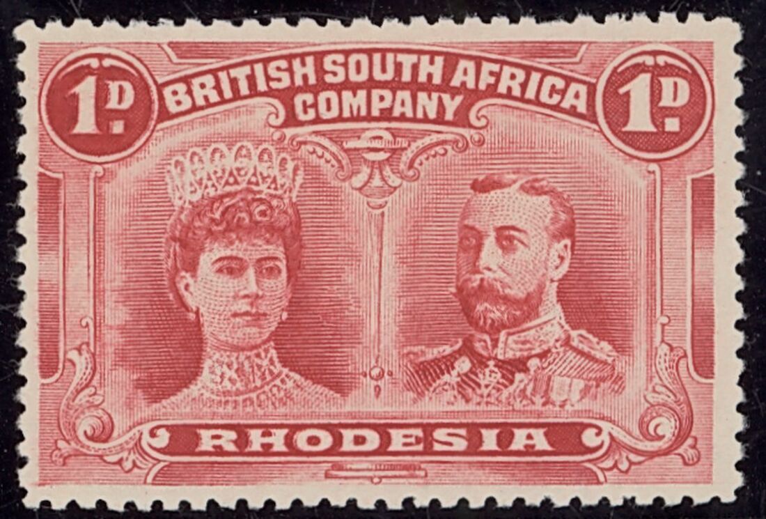 1d. bright carmine, [63] showing major re-entry to Queen's neck, left value tablet and left side of Rhodesia panel; a scarce variety. S.G. 123 var.
