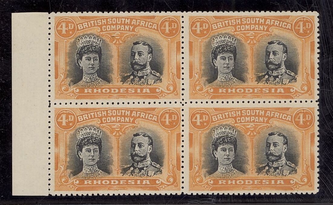 4d. black (worn) and orange, hook headplate, block of four from the left of the sheet, [26-27, 31-32], fine and fresh mint. RSC B