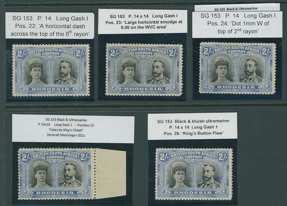 2/- black and ultramarine, long gash headplate, a mint group of five plated examples including [22], [25] showing lines by King's cheek and [26] showing King's button flaw; fine and fresh mint. S.G. 153 group (5)