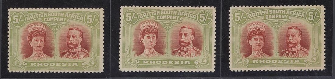 5/- scarlet and pale yellow-green, short gash headplate, two plated examples [36] and [46] and 5/- deep-red and yellow-green, short gash headplate, [29] (S.G. 160 variant i); fine mint. S.G. 160, 160 v. i