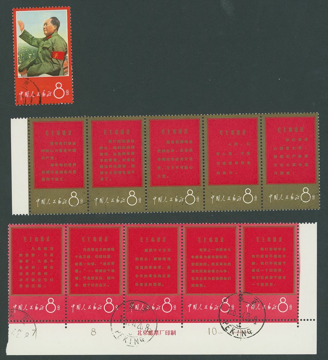 1967 (20 Apr.) "Long Live The Invincible Chairman Mao's Thought" (W1) 8f. complete set of eleven, C.T.O., one of the se-tenant strip of five (W7-W11) with corner imprint margin, tarnished gold, slightly toned, strips folded on one row as usual, fine appearance. Yang W1-W11