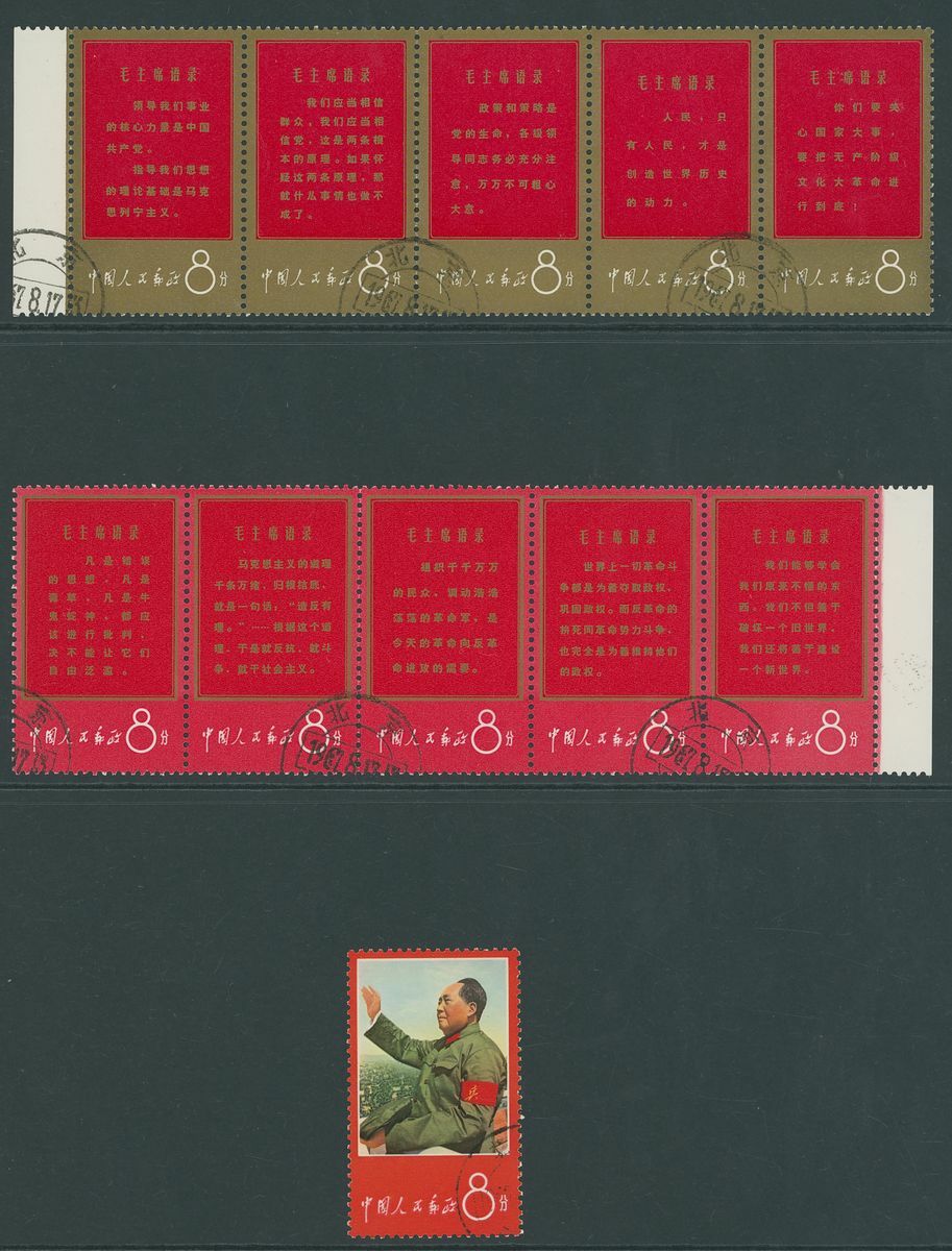 1967 (20 Apr.) "Long Live The Invincible Chairman Mao's Thought" (W1) 8f. complete set of eleven, C.T.O., one of the se-tenant strip of five (W2-W6) with horizontal crease across top though with good gold colour, strips folded on one row as usual, fine appearance. Yang W1-W11