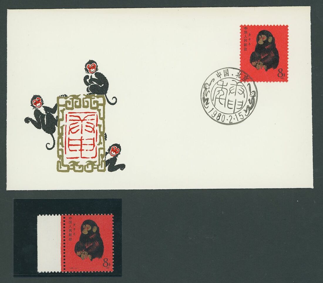 1980 (15 Feb.) Year of the Monkey, (T46), a Peking Branch illustrated unaddressed First Day Cover, and a left margin mint large part original gum example. A fine duo.