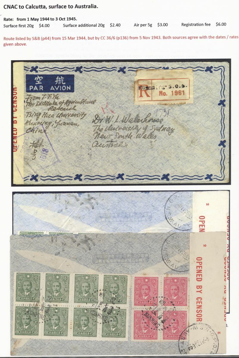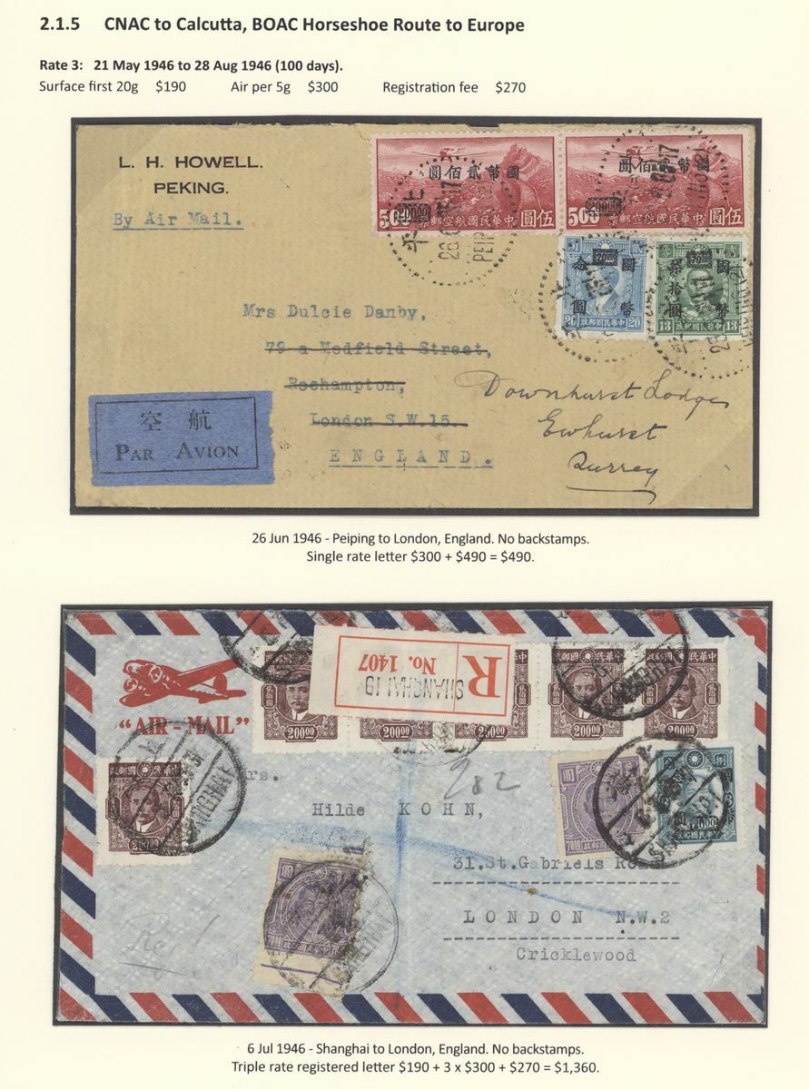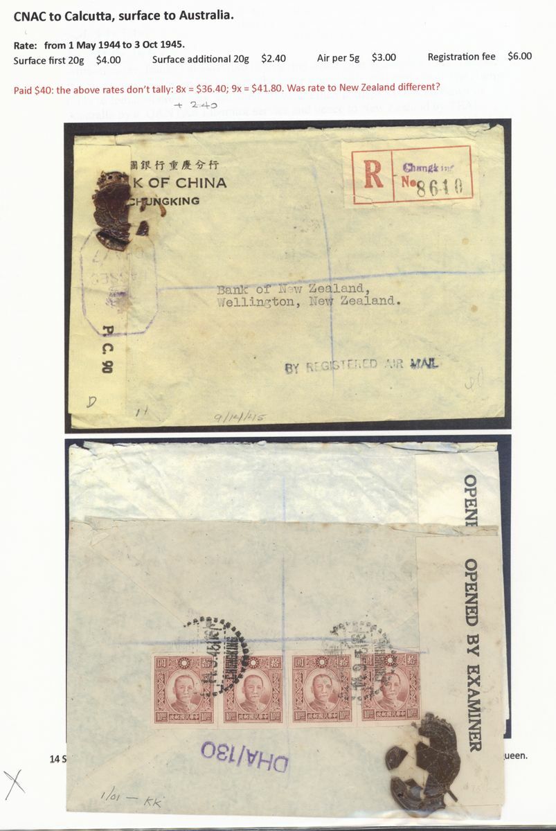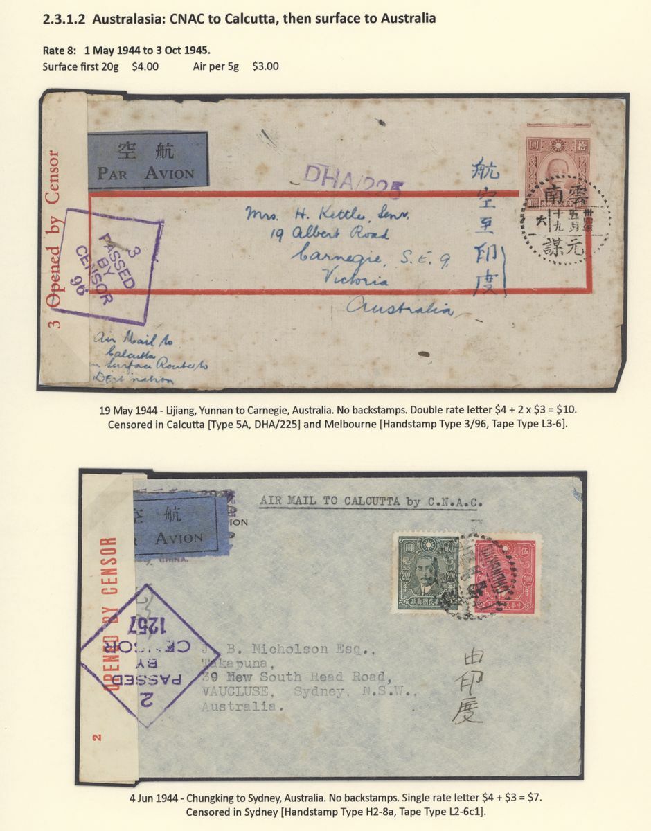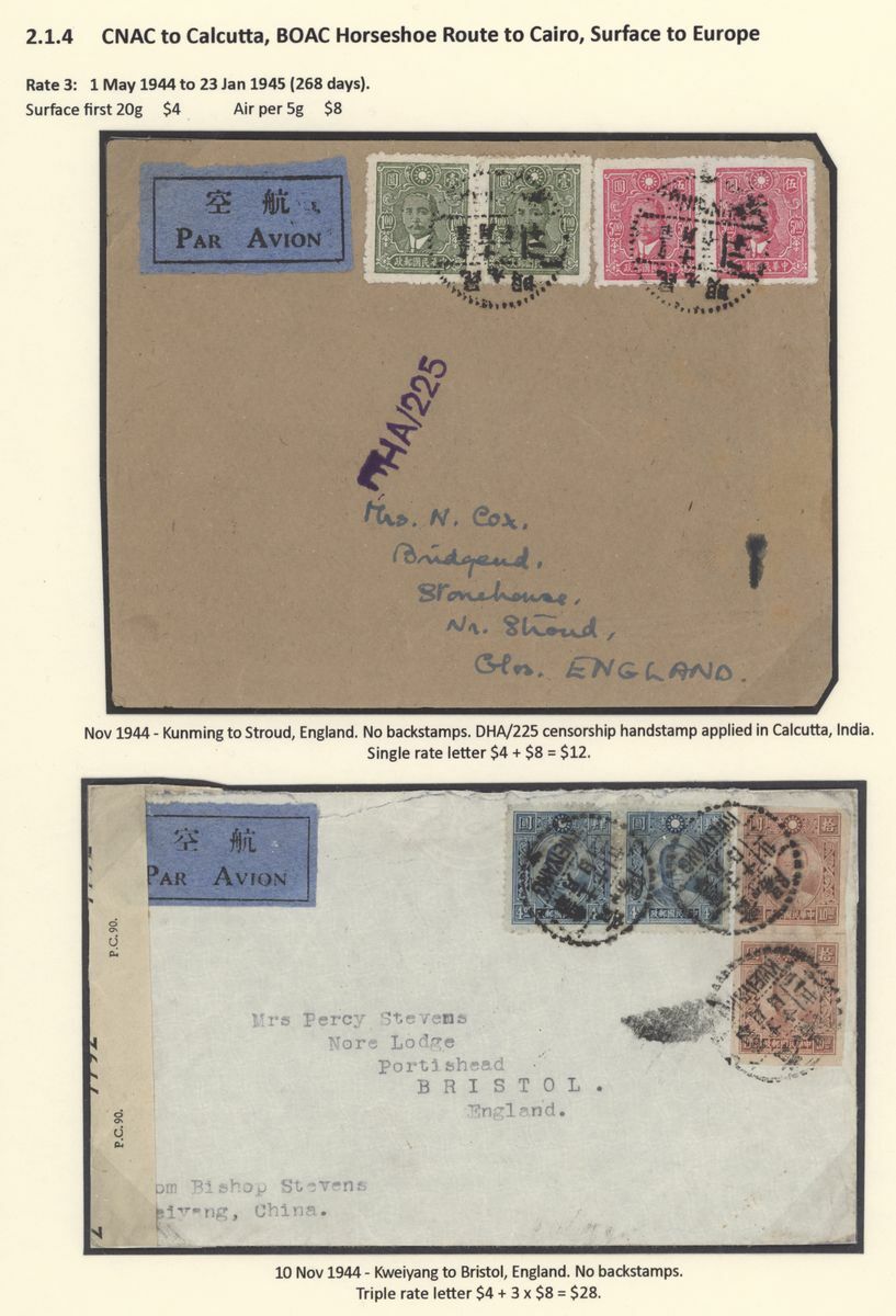 A collection of China International Air Mails, World War Two, Uniform rates with a range of different frankings, rates and destinations (20) including CNAC to Calcutta, the BOAC Horseshoe route to Cairo, BOAC route to Poole, PAA Hurn to New York and with destinations including England, USA, Canada, Australia and New Zealand; a good group