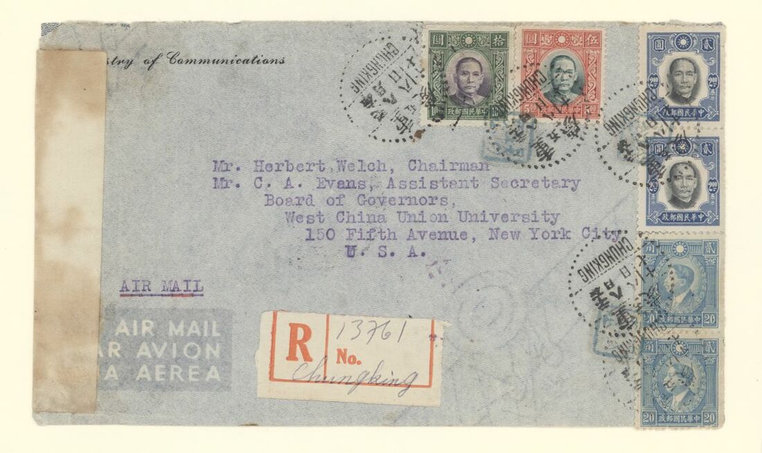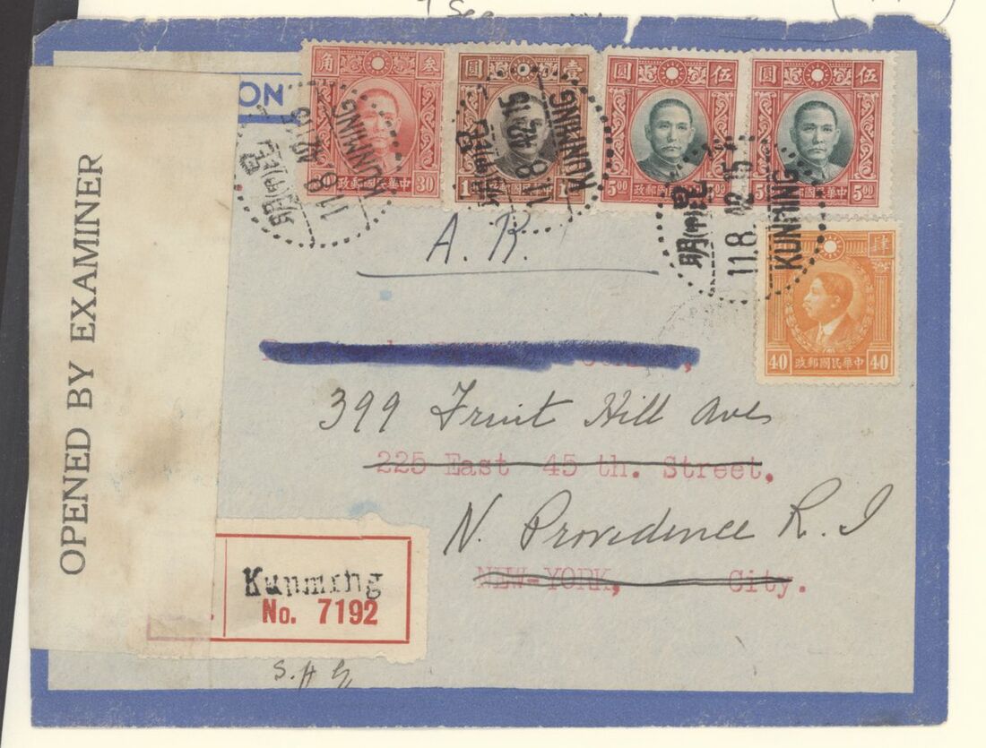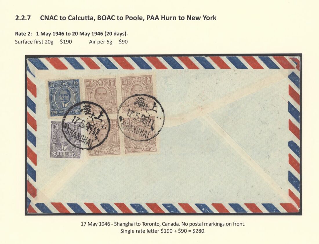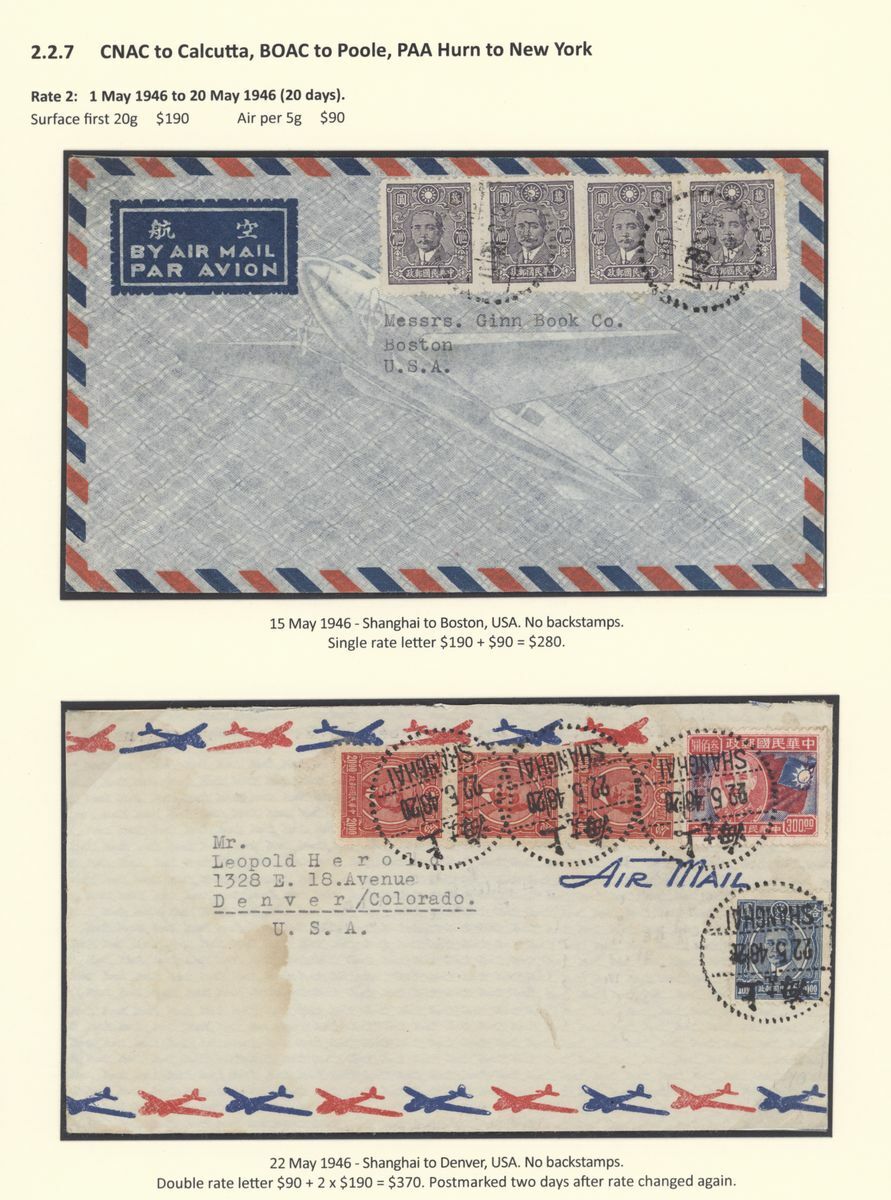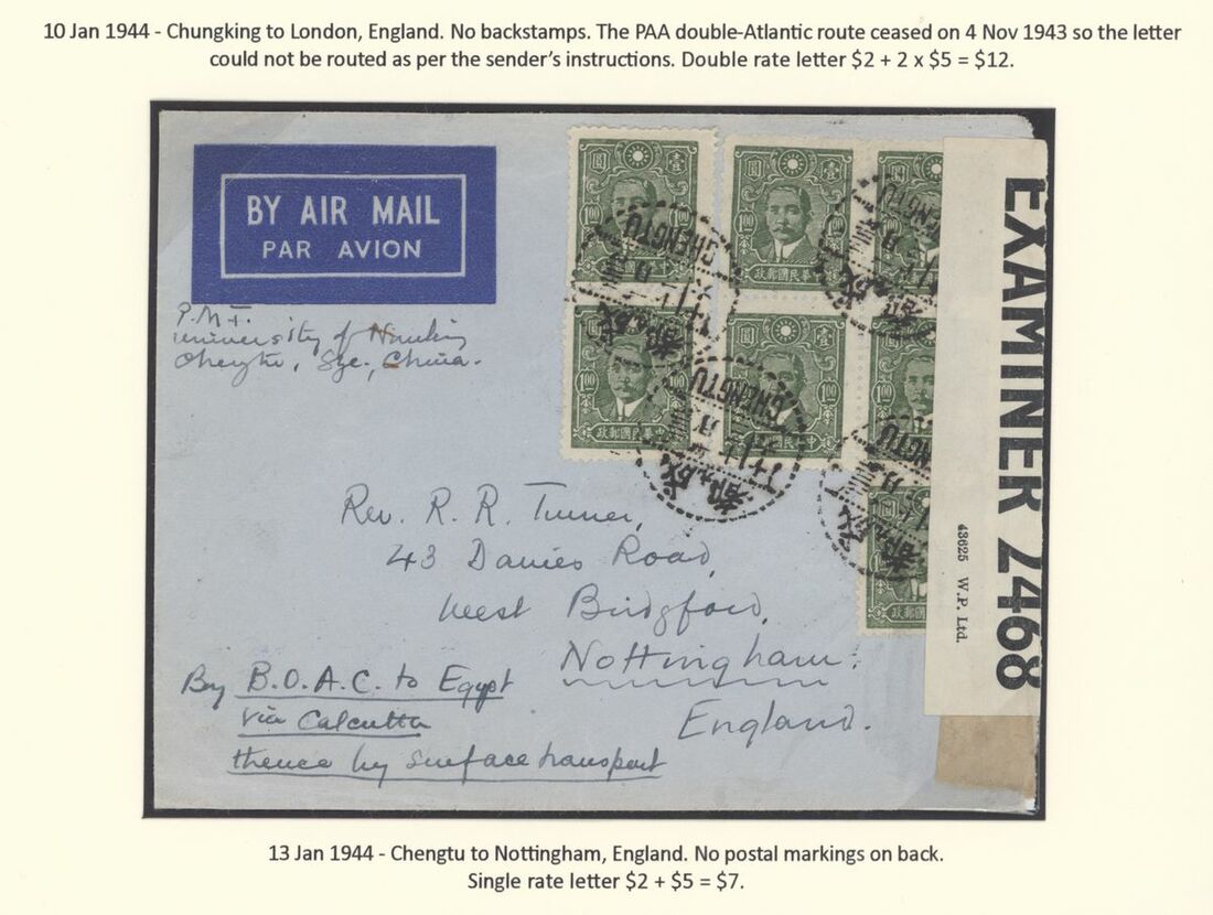 A collection of China International Air Mails, World War Two, Uniform rates with a range of different frankings, rates and destinations (20) including CNAC to Calcutta, the BOAC Horseshoe route to Cairo, BOAC route to Poole, PAA Hurn to New York and with destinations including England, USA, Canada, Australia and New Zealand; a good group