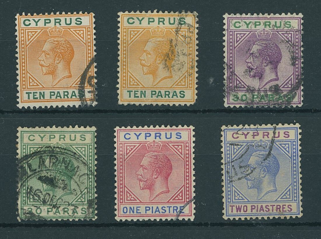 1912-23 variety broken bottom left triangle used selection (6) including 1912-15 10pa. (2), 30pa., 1921-23 30pa. green, 1pi. carmine and blue, 2pi. blue and purple. Mixed condition, a difficult group to assemble.