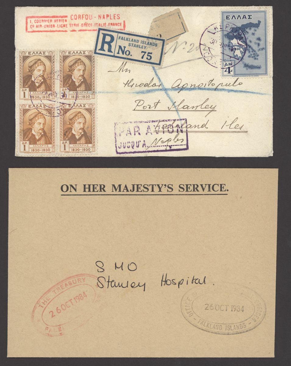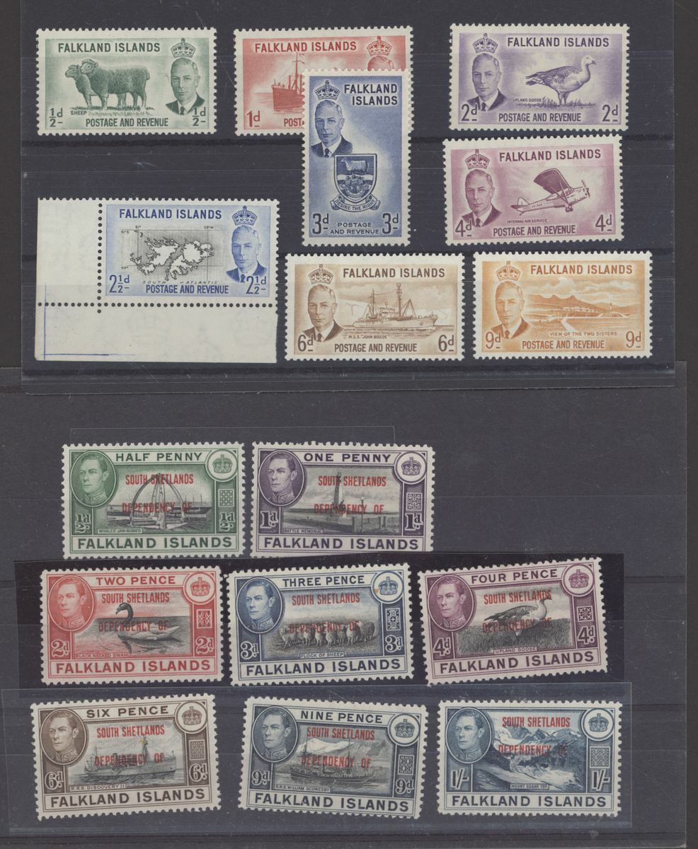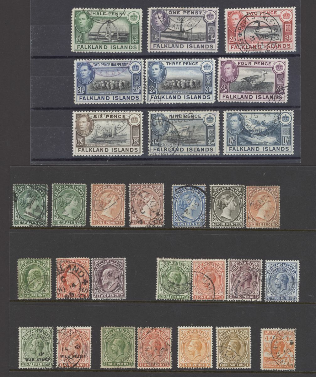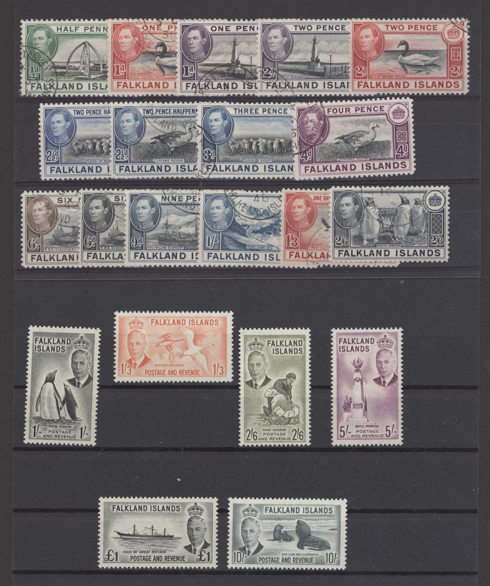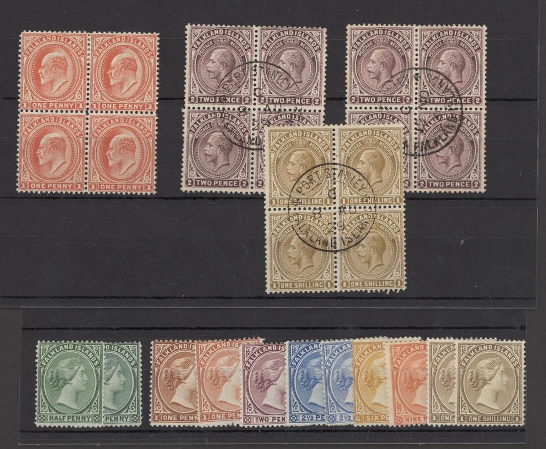 A mint and used group on stock cards, Hagner pages etc. including QV values to 1/- mint, KEVII 3/- green both mint and used, KGV including 1918-20 War Stamp 1/- block of forty-eight mint and also some used mulitples, 1952 set to £1 mint, a range of covers including 1930 incoming cover from Greece to Port Stanley, etc. a good group