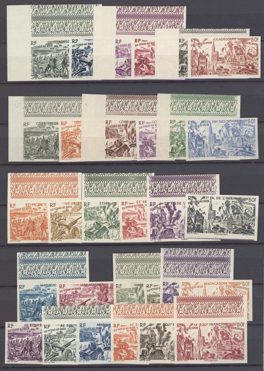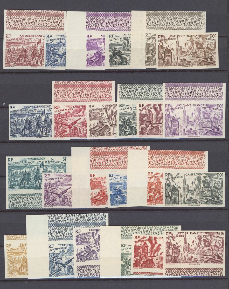 1946 Tchad au Rhin selection of mint complete Air mail imperforated different sets (9) including 'Afr. Occ. Francaise', 'Guyane', 'Cameroun', 'Et. Fr. Dans l'Inde', 'Guadeloupe', 'Cote Fr. Des Somalis', 'Et. Fr. De L'Oceanie', 'Madagascar', 'Af. Eq. Francaise'. Generally fine.