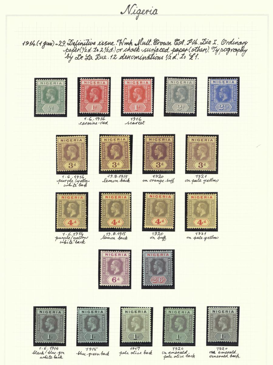 1912-36 mint group on album pages comprising Northern Nigeria 1912 MCA set to £1, Southern Nigeria 1912 MCA set to £1, Nigeria 1914 MCA set to £1 including a number of shades with 3d. (4), 4d. (4), 1/- (5), 5/- (5), 10/- (5, including green and red with pale olive back with RPS Cert.) and £1 (4), 1921-32 Script set to 10/- with some shades including 5/- (2) and 10/- (2) and 1936 set to £1; good to fine mint. S.G. cat. value in excess of £3,800