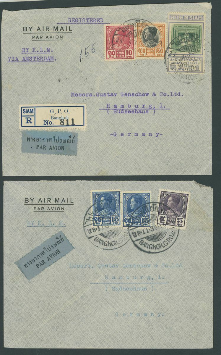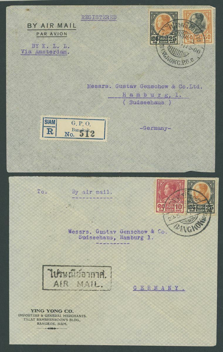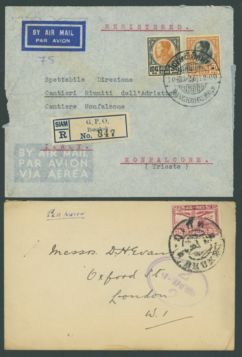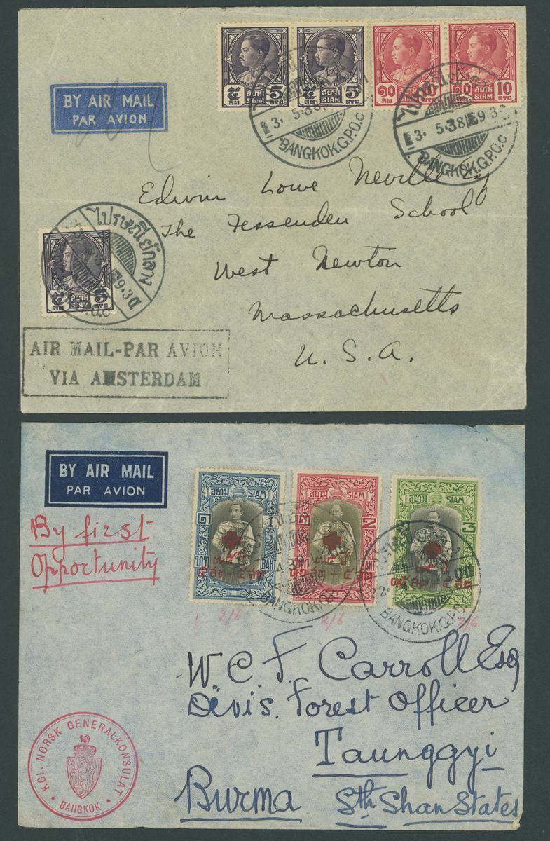 1929-55, selection of twenty-five covers and cards, mostly Air Mails, including 1939 Red Cross set on cover from the Norwegian Consulate in Bangkok to Burma, etc., also 1917 Waterlow 10b. and 20b. used blocks of four. Chiefly fine
