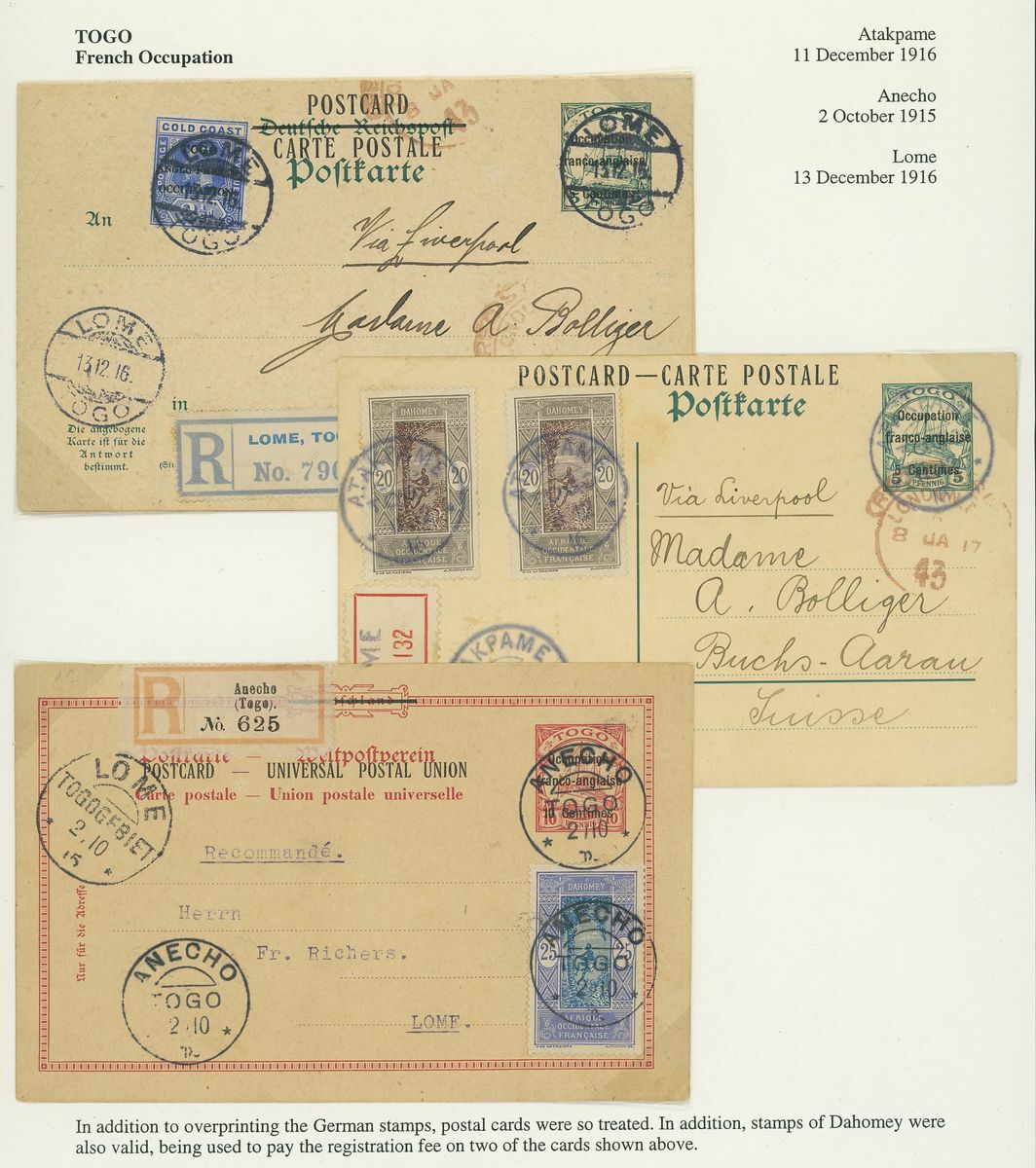 Postal Stationery: 1915-16, three overprinted German cards, Registered from Anecho, Atakpame or Lome, and uprated by West African or British Occupation issues; fine