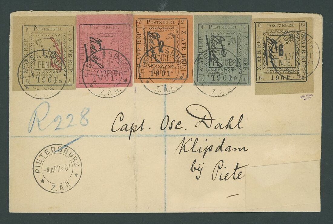 1901 (4 Apr.) envelope (159x103mm.) with embossed Arms in green on flap) registered to Captain Dahl at Klipdam, bearing imperforate ½d. to 1/- set of six, all cancelled with "