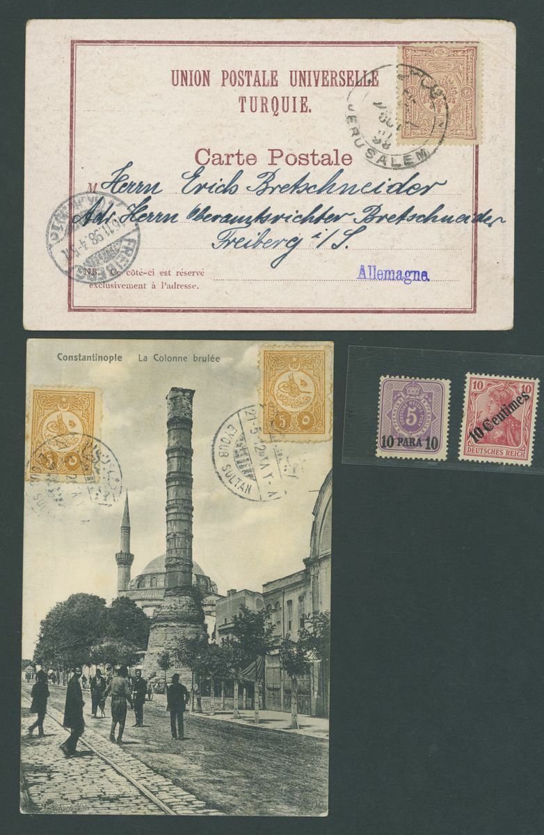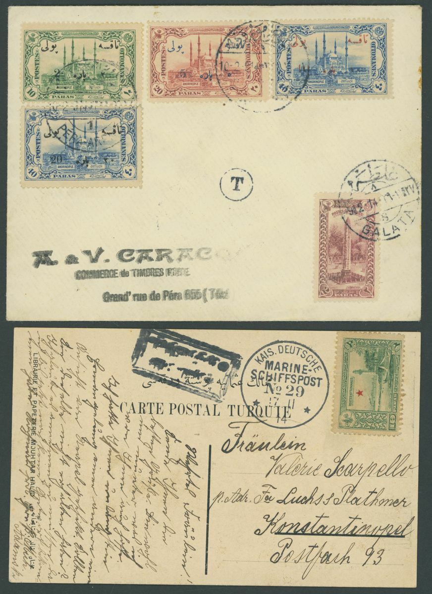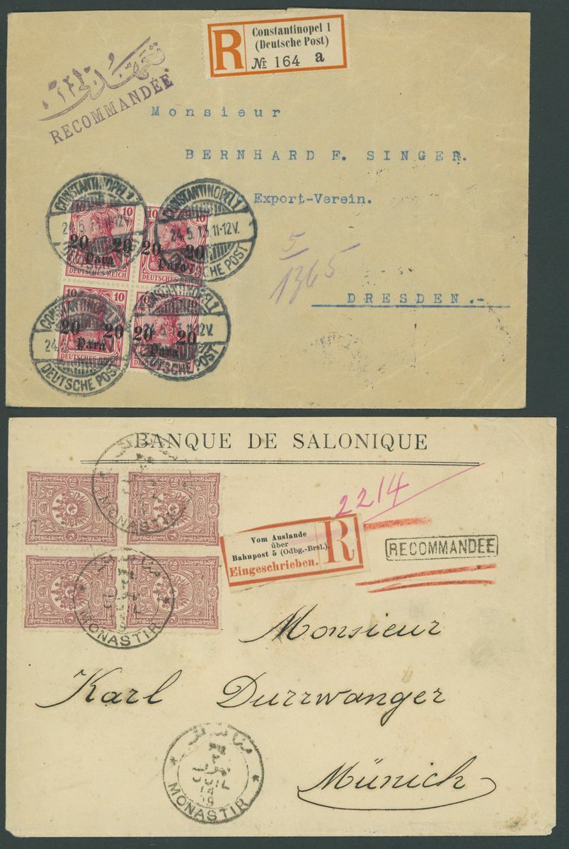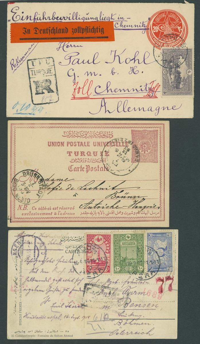 Selection of fifty-seven covers or cards, including 1899 envelope to Munich franked 20pa. block of four and with German "Von Auslande" registration etiquette, 1901 p.p.c. to Paris with framed Pera cancellation, 1914 p.p.c. (Battleship Sultan Selim) to Constantinople with Marine Schiffpost No. 29 c.d.s., Postal Stationery with 1921 20pa. envelope Registered to Germany, additionally franked 10pi. on the front 1pi., 3pi. and 20pi. on the reverse and with German Customs label, German Post Offices, etc., chiefly good to fine