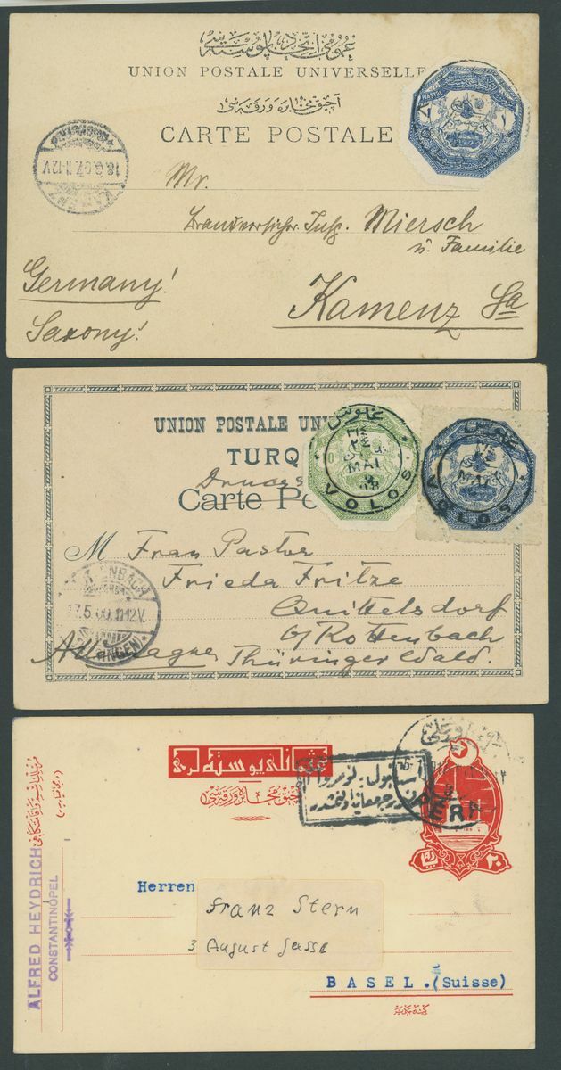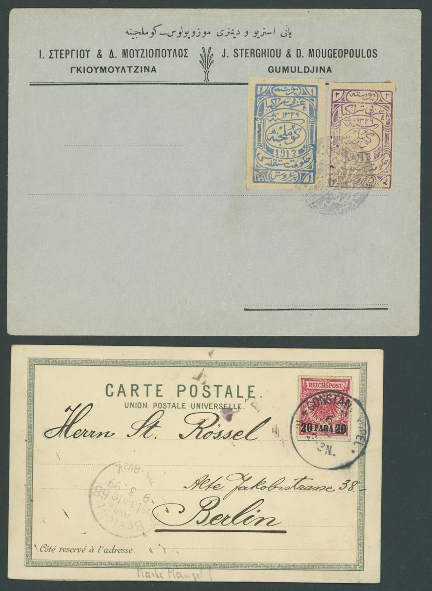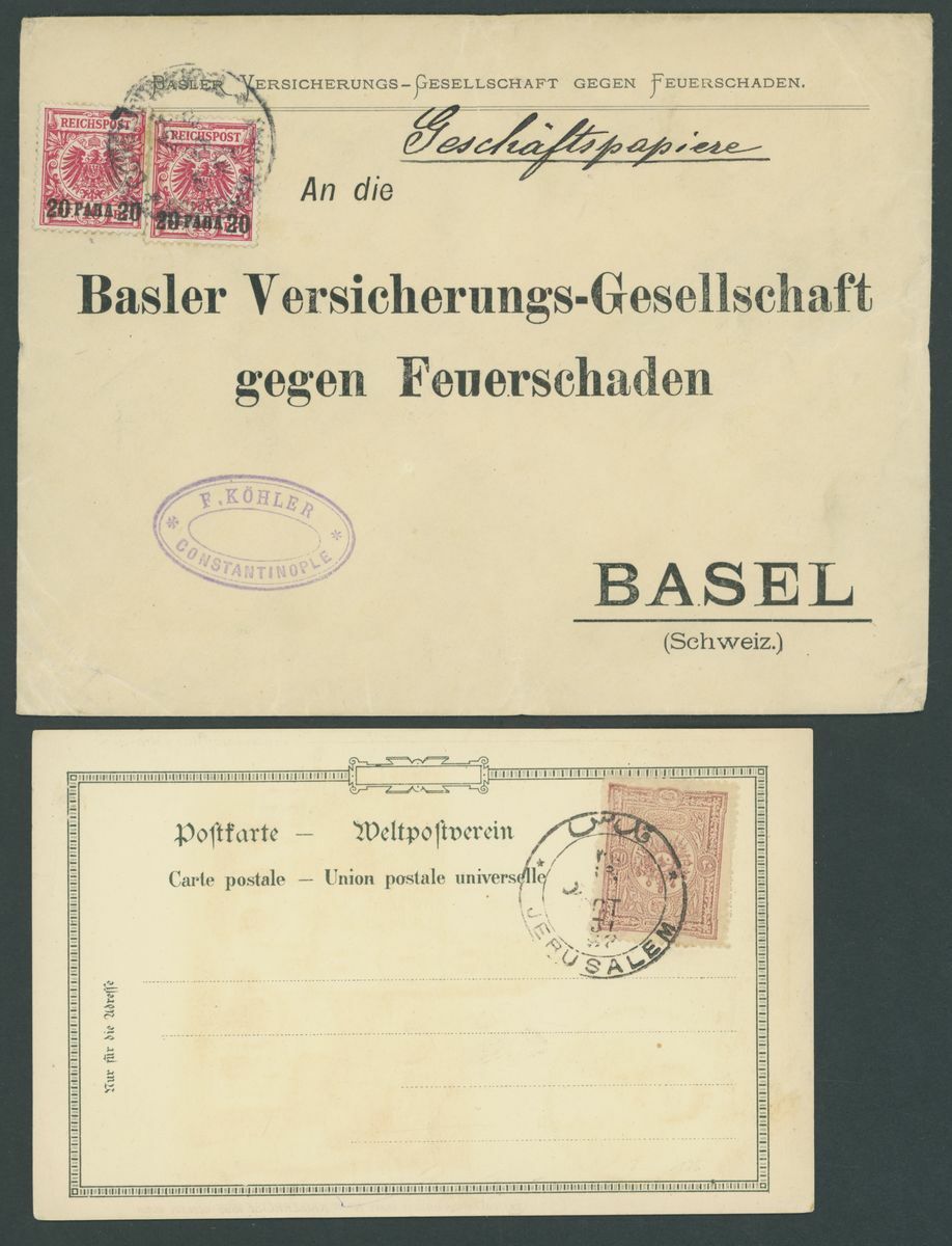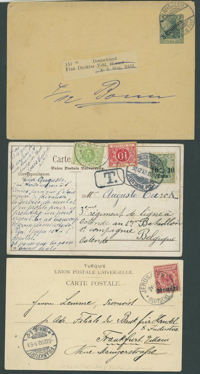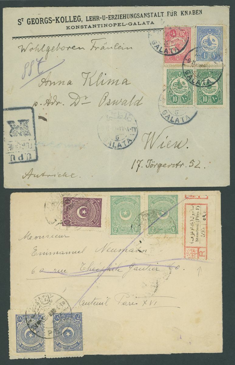 Selection of fifty-seven covers or cards, including 1899 envelope to Munich franked 20pa. block of four and with German "Von Auslande" registration etiquette, 1901 p.p.c. to Paris with framed Pera cancellation, 1914 p.p.c. (Battleship Sultan Selim) to Constantinople with Marine Schiffpost No. 29 c.d.s., Postal Stationery with 1921 20pa. envelope Registered to Germany, additionally franked 10pi. on the front 1pi., 3pi. and 20pi. on the reverse and with German Customs label, German Post Offices, etc., chiefly good to fine