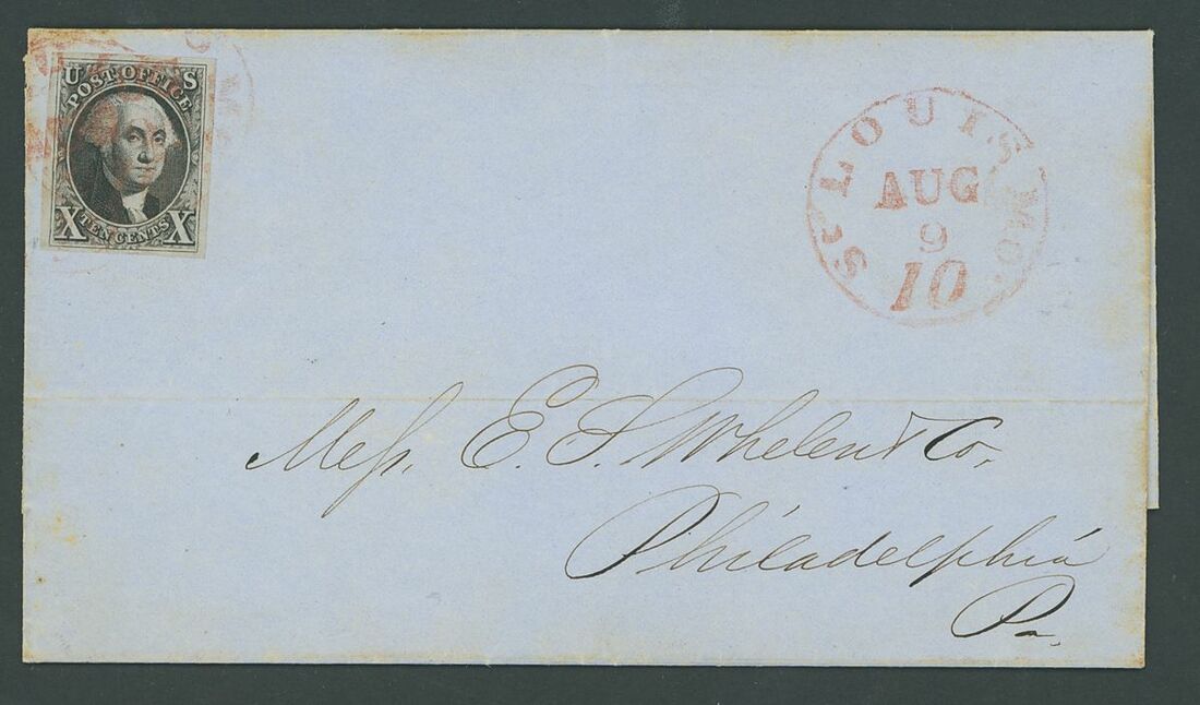 1850 (9 Aug.) entire letter from St. Louis addressed to Philadelphia bearing 10c. black with good to large margins all around, cancelled by despatch c.d.s. Letter with minor peripheral toning not affecting the adhesive otherwise fine and attractive. P.F. certificate (1981). Scott 2