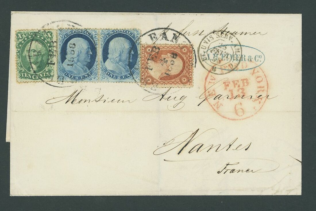 1858 (4 Feb.) entire from New Orleans addressed to France bearing 1c. blue type IV horizontal pair pos 82-83 both showing slight double transfer, 3c. red and 10c. green Type II cancelled by despatch c.d.s. with adjacent New York paid '6' (13.2) c.d.s. The reverse with transit Paris (28.2) and arrival (28.2) c.d.s. Minor faint perfs toning and a usual horizontal archive fold not affecting the adhesives otherwise fine and attractive. Scott 23, 26, 32
