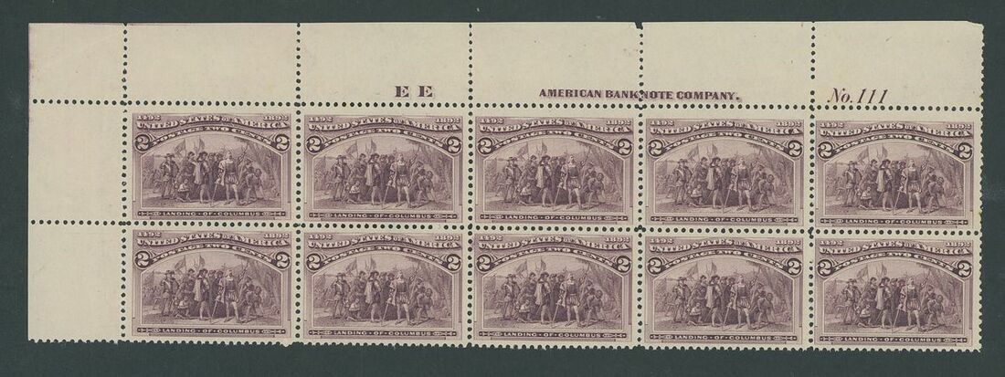 2c. brown violet, upper left corner block of ten (5x2) with imprint, plate no. 111 and letter "E E", unmounted mint fresh original gum. Very fine and most desirable positional block. Scott 231