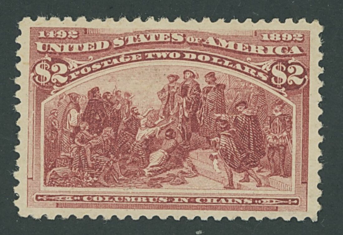 $2 brown red, very well centred, large part fresh original gum. Very fine. P.S.E. certificate (2009) (XF-Sup 95, Mint OGph, SMQ $4,000). Only five unused $2.00 Columbian stamps grade higher than this example (four mounted and one unmounted mint.) Scott 242