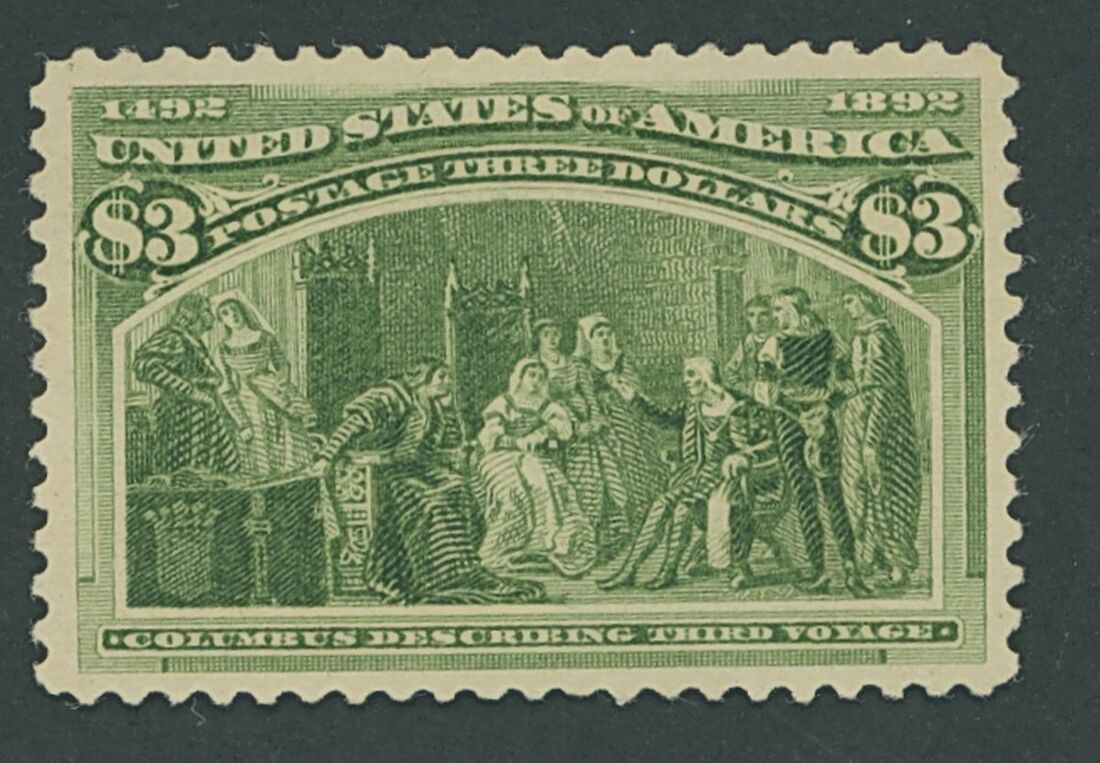 $3 olive green, very well centred, large part fresh original gum. Very fine. P.S.E. certificate (2004) (XF 90, Mint OG, SMQ $2,500). Scott 243