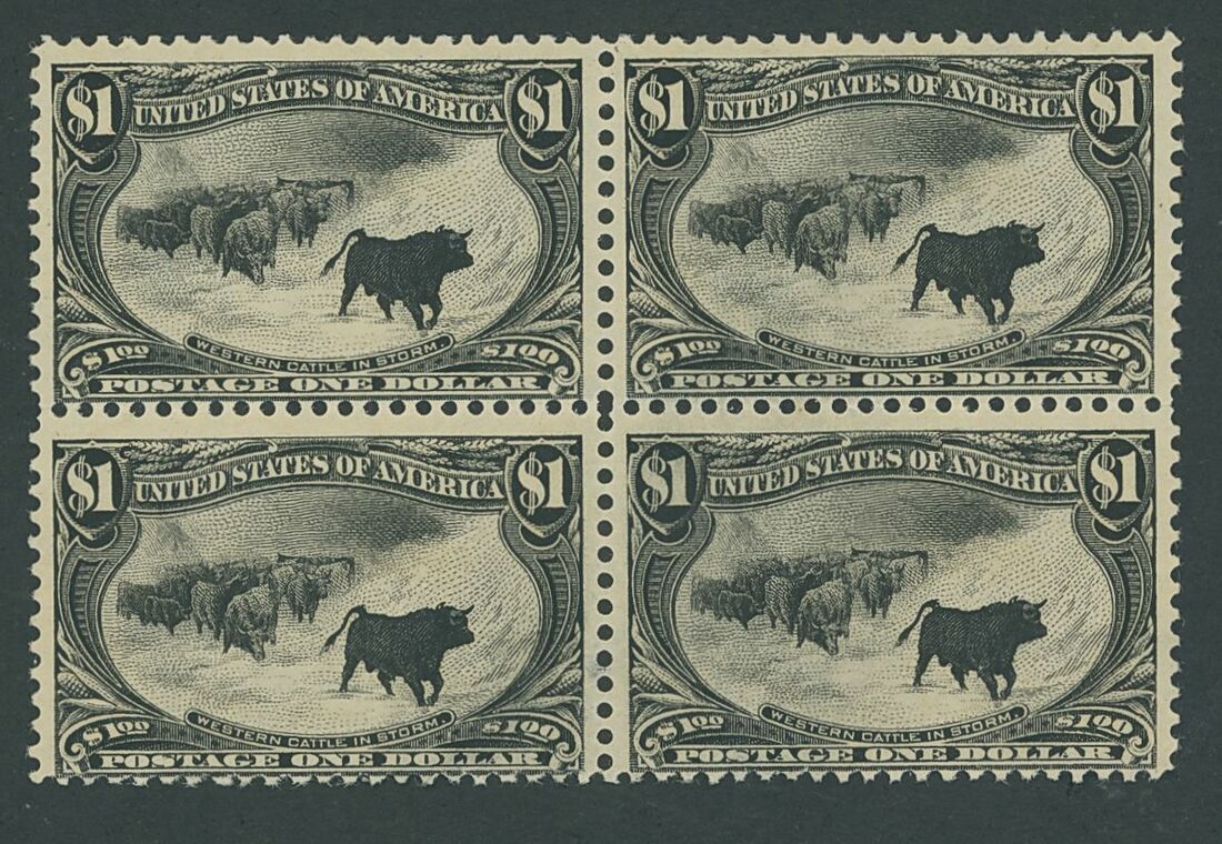 $1 black block of four, centred a little low, unmounted mint with fresh original gum, lightly fold through horizontal perfs otherwise a fine and very rare block. Scott 292 $15,000 (as for unmounted stamps). Photo