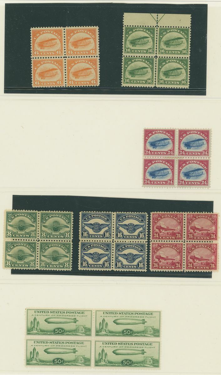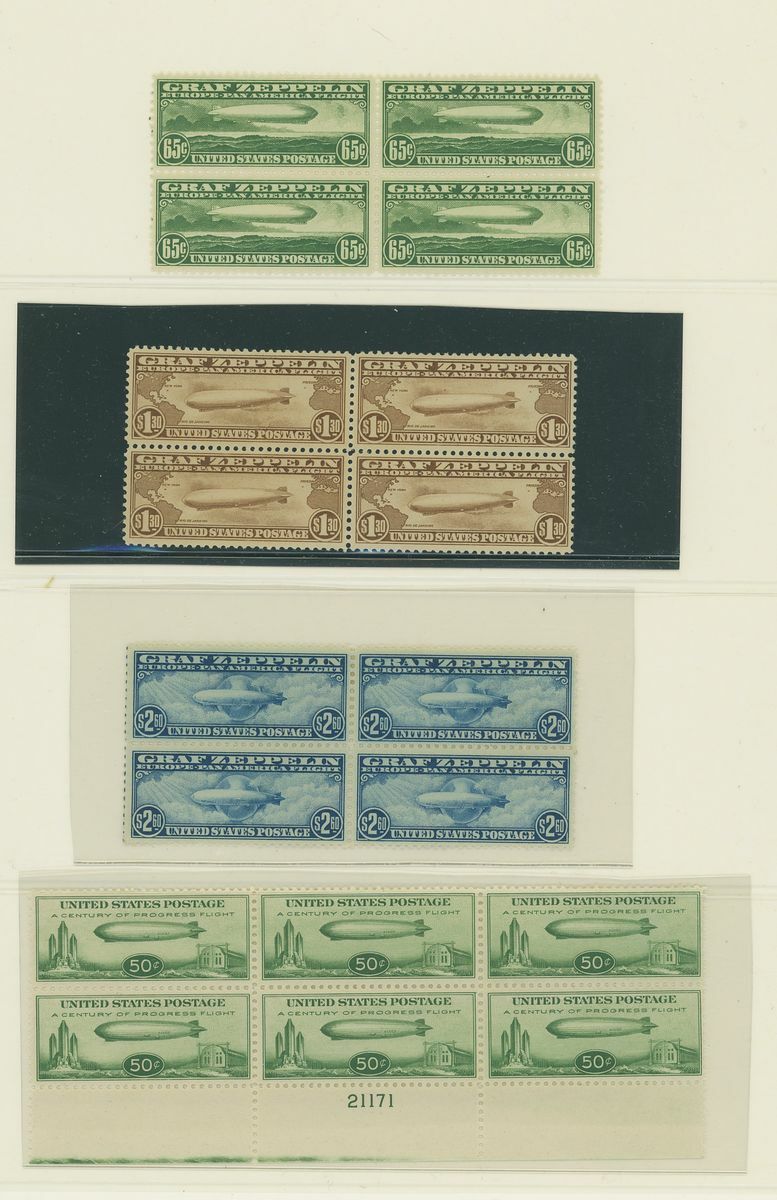 1918-33 selection of mint blocks of four including 1918 to 24c., 1923 to 24c. 1930 Zeppelin to $2.60 (the $1.30 is almost split in two vertical pairs), 1933 50c. plus extra plate block of six. The Zeppelin and the 1933 stamps have upper stamps mounted and lower stamps unmounted. Generally fine.