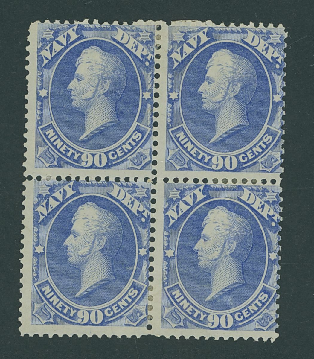 1873 90c. ultramarine block of four, large part original gum, fresh colour, hinge reinforcement and a couple of short perfs not detracting the overall appearance. Fine and rare. Scott O45 $6,250