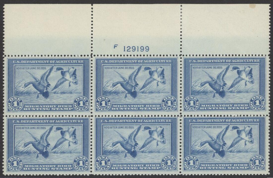 1934 $1 blue (Mallards) in an upper margin plate no. F129199 block of six, unmounted mint original gum; a few light gum bends and small perf. reinforcement in top margin. Rare. Missing only side sheet margin to be considered a full plate block, which catalogues $14,500. Scott RW1.