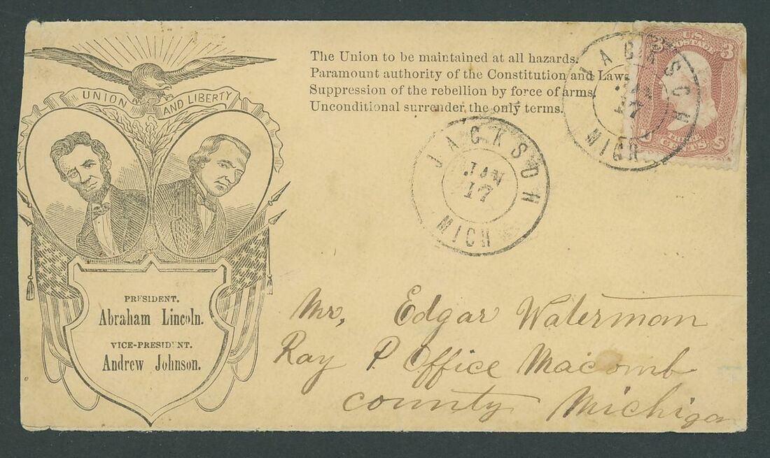 Lincoln-Johnson portraits in oval with eagle, flags and campaign slogan printed envelope addressed to Macomb, Mich. bearing 3c. rose (faulty) tied by Jackson (17.1) c.d.s. Envelope reduced at left still quite fresh and fine a scarce design. Scott 65