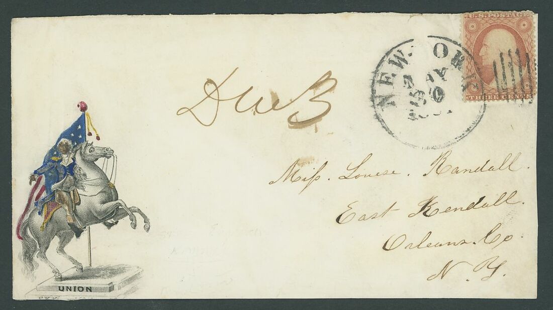 Ramping Horse and Flag Kimmel design cover addressed to East Kendall, NY, bearing 3c. dull red (small tear at top), tied by New York (30.5) d.s. and showing manuscript Due 3. Envelope opened and rejoined on four sides otherwise quite fresh and of very fine appearance. P.F. Certificate (1991). Scott 26