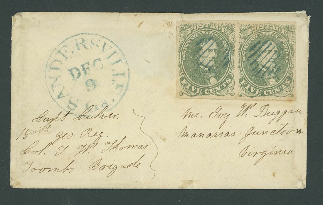 1861 (9 Dec.) envelope from Sanderville addressed to Manassas Junction c/o an officer in Toombs Brigade bearing 5c. olive green horizontal pair with good margins all around cancelled by blue grids with adjacent despatch c.d.s. Part of backflap missing, slight edgwear and soiling, nevertheless an attractive use of early shade. Scott 1c