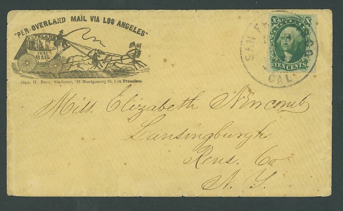 1860 (Feb.) Overland Via Los Angeles Illustrated Stagecoach Envelope on light yellow addressed to Lansingburgh N.Y., bearing 10c. Green type V cancelled by San Francisco c.d.s. Flap loose, some toning specks, otherwise fine. Scott 35
