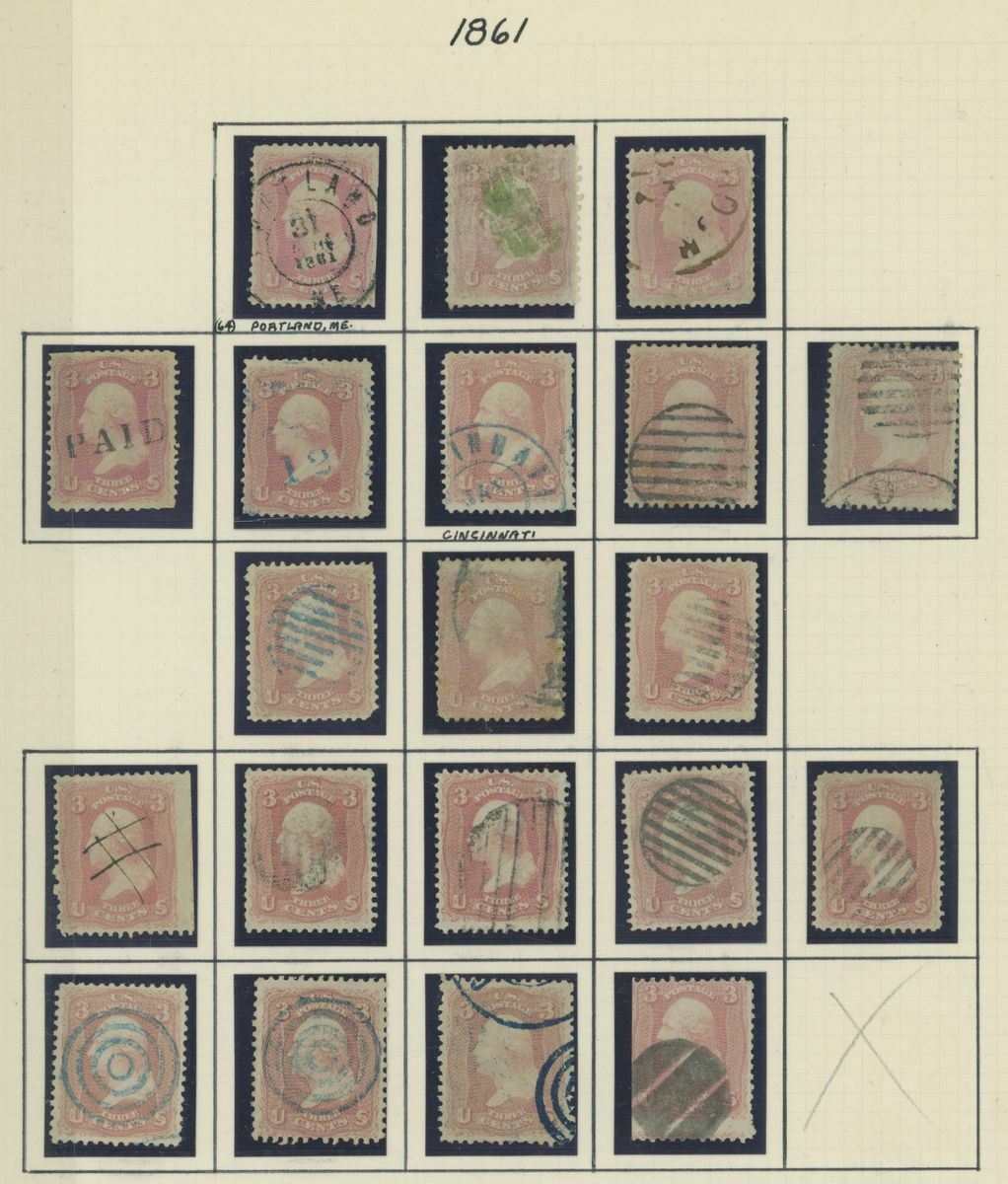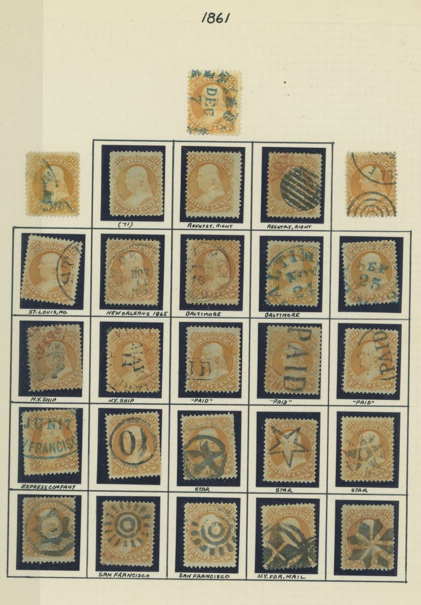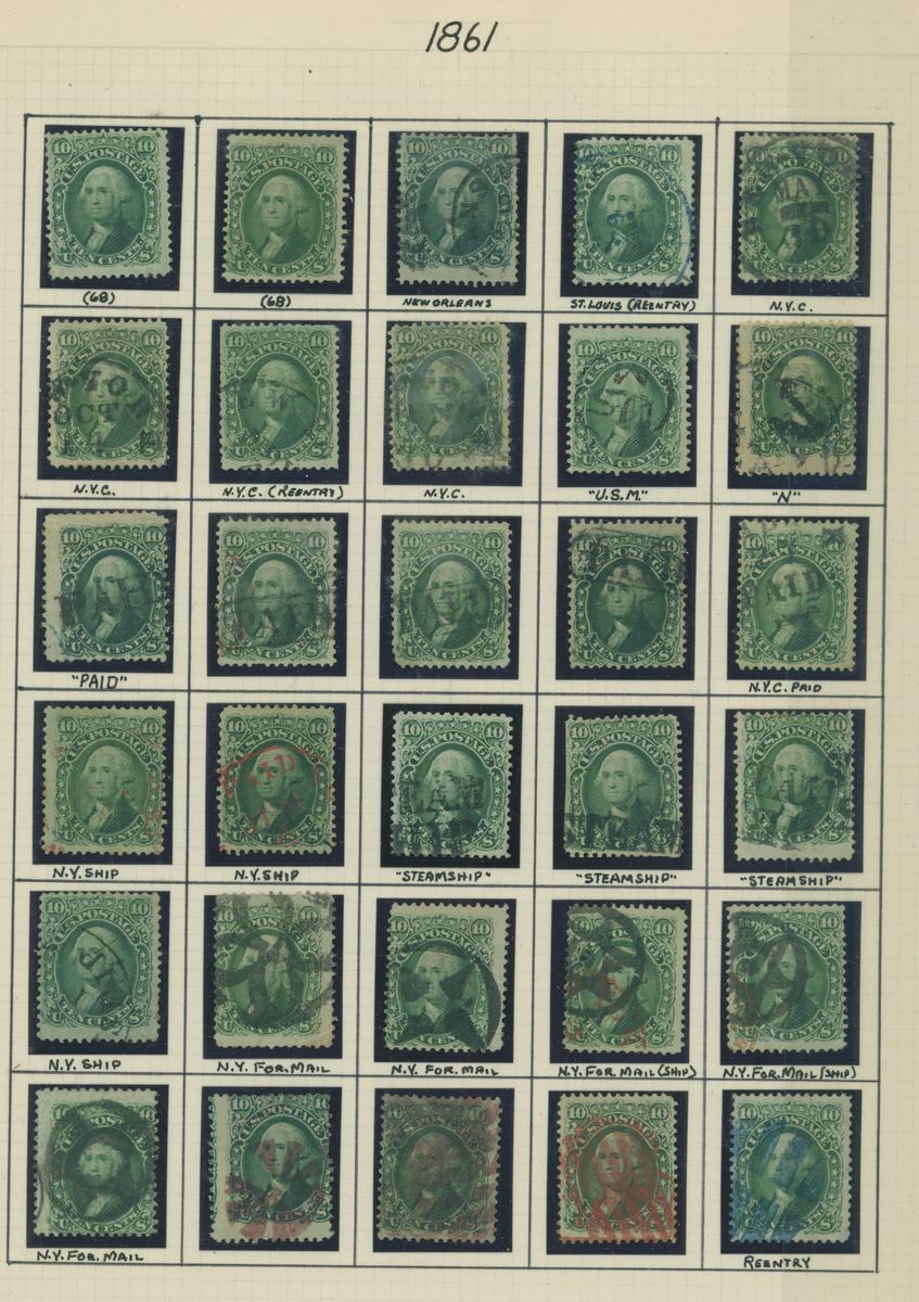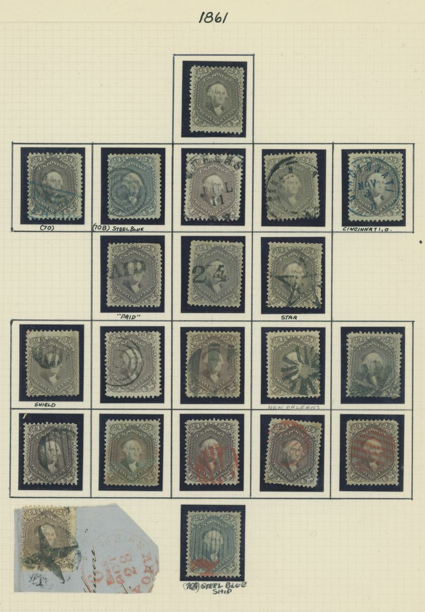 1861 issue duplicated mostly used collection neatly arranged on twelve written up pages including 1c. (94), 3c. (20), 5c. (10), 10c. (50), 12c. (26), 24c. (21), 30c. (26), 90c. (5), with some different types, shades and cancellations, the few of unused appearance with no gum, mixed condition though a great lot for the specialist of this issue.