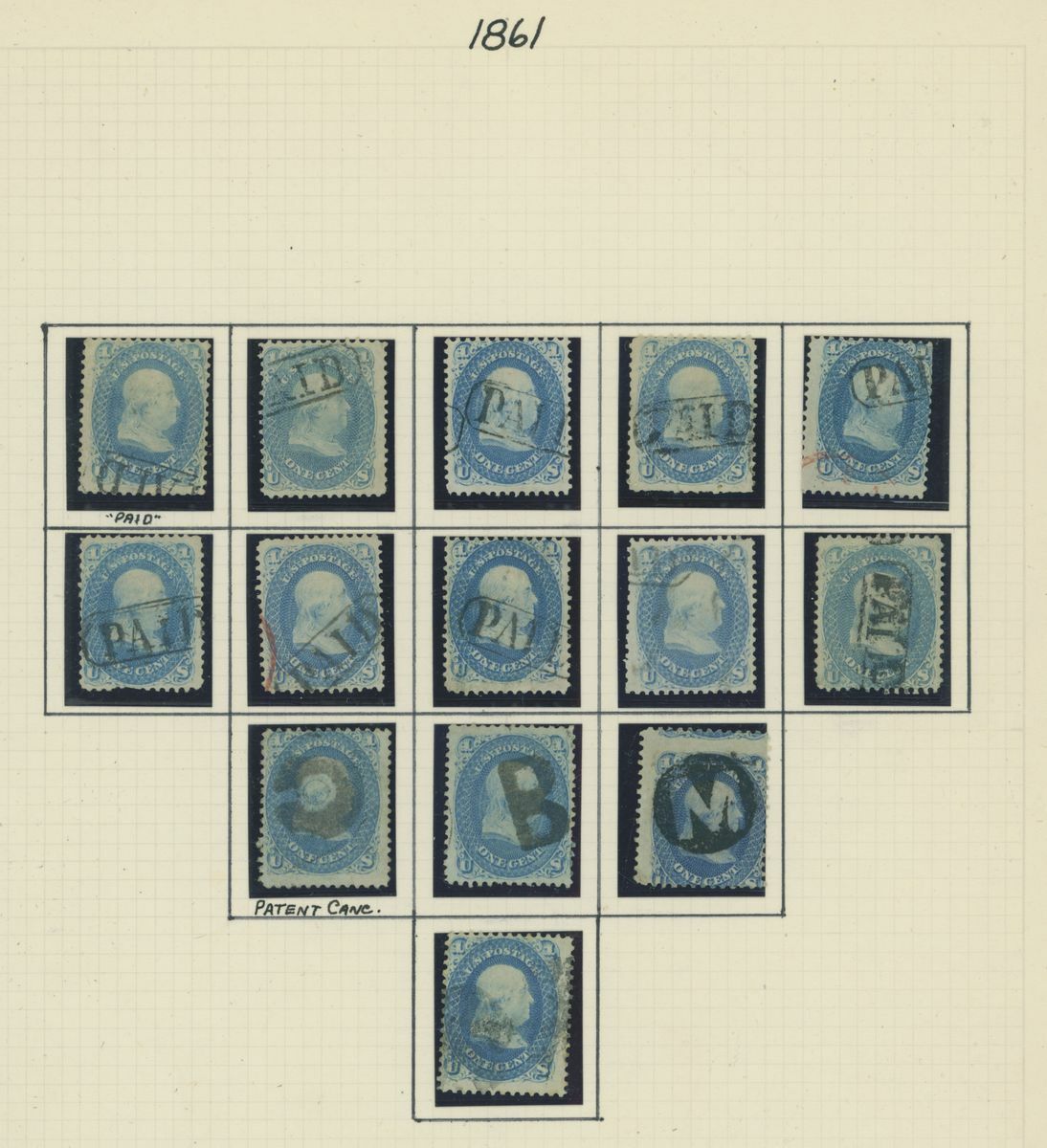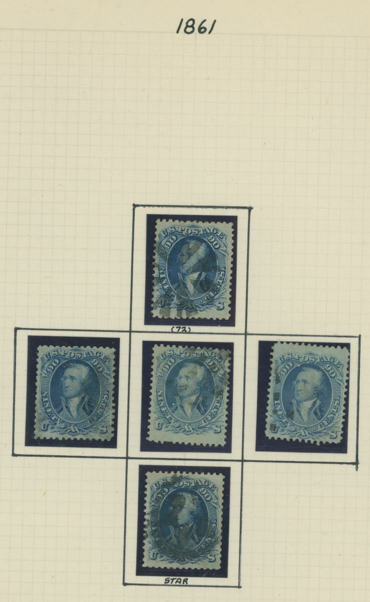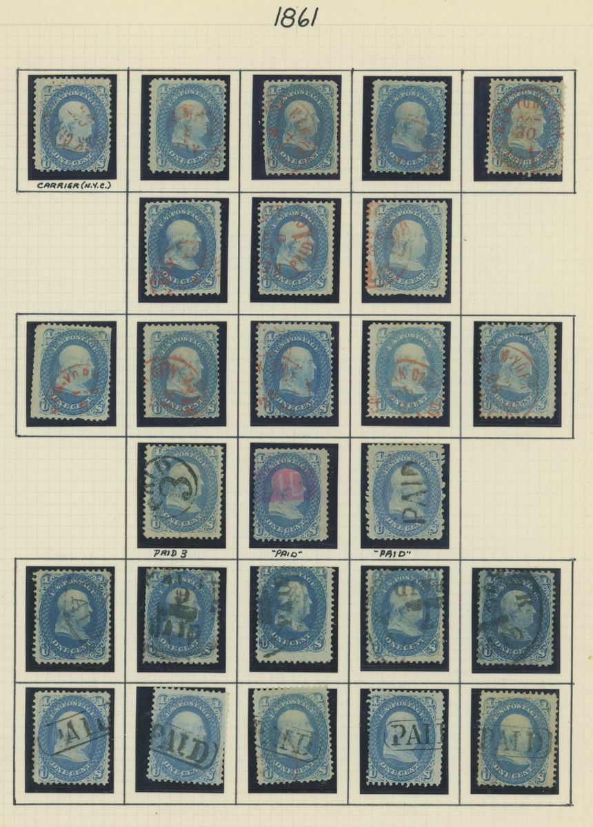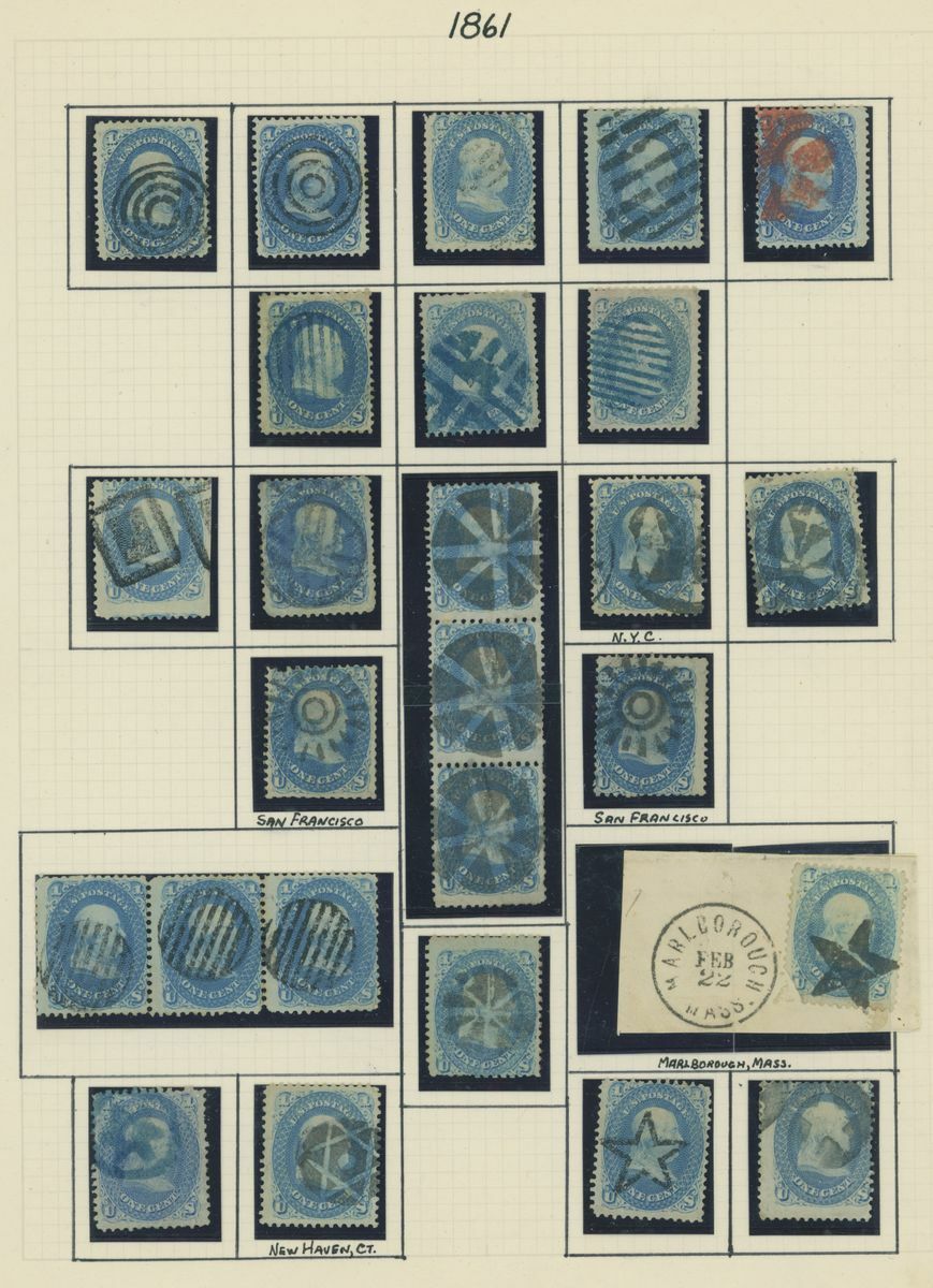 1861 issue duplicated mostly used collection neatly arranged on twelve written up pages including 1c. (94), 3c. (20), 5c. (10), 10c. (50), 12c. (26), 24c. (21), 30c. (26), 90c. (5), with some different types, shades and cancellations, the few of unused appearance with no gum, mixed condition though a great lot for the specialist of this issue.