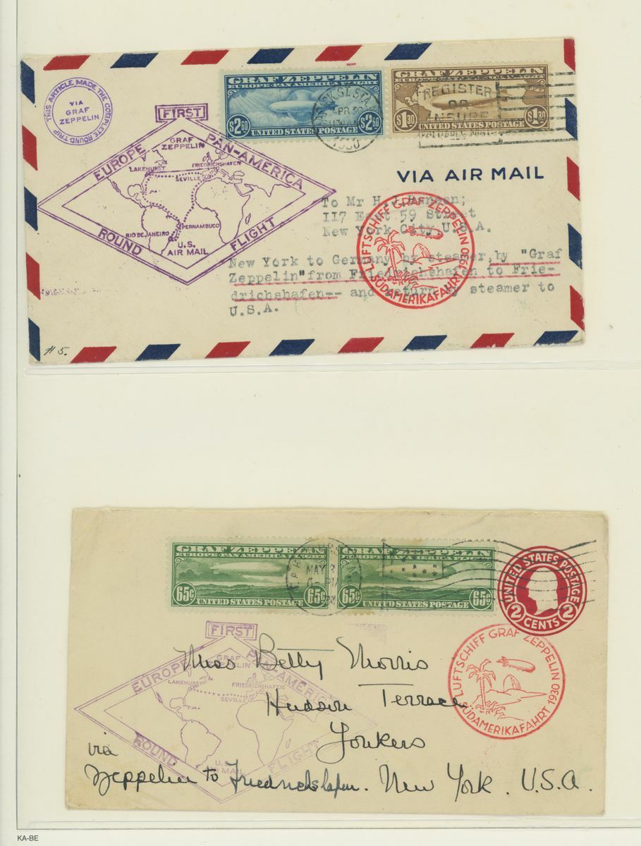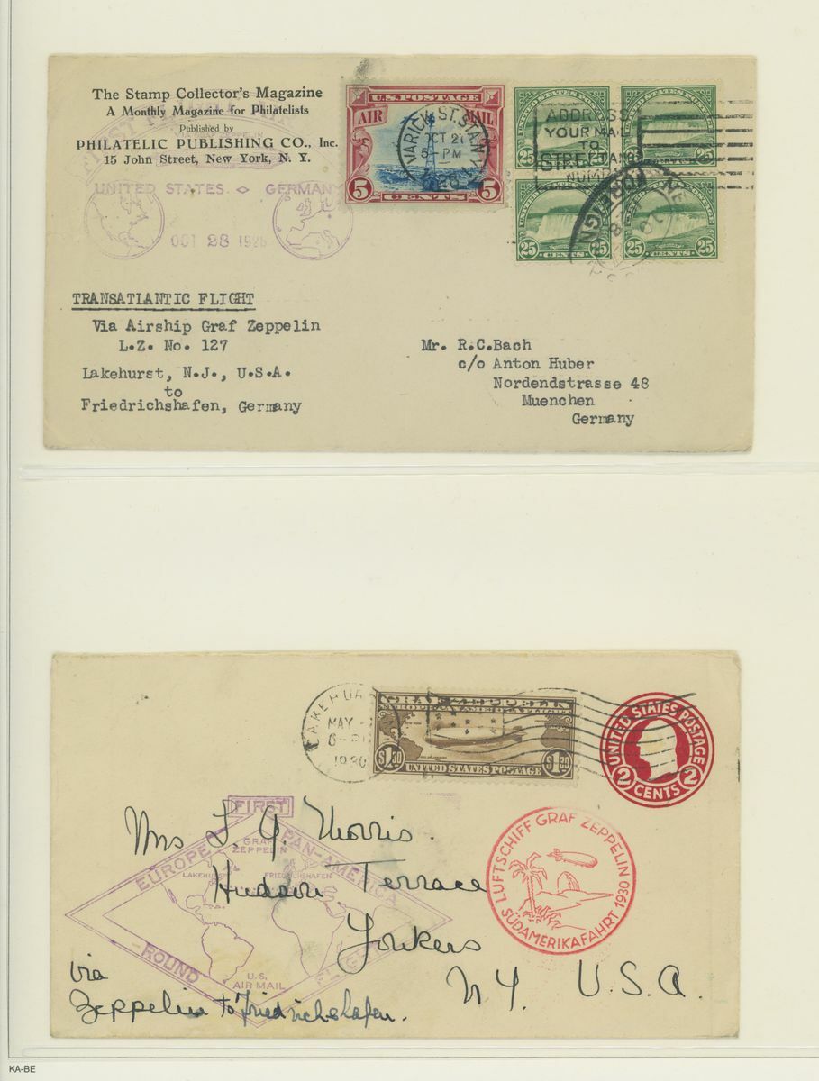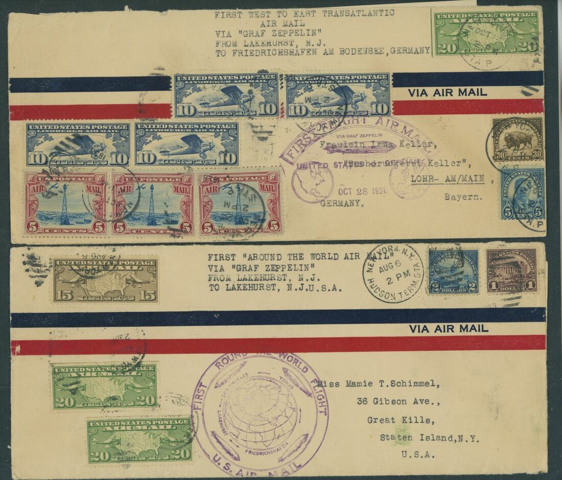 1928-30 Air mail selection (8) including 1928 First West to East Transatlantic Air Mail cover addressed to Germany (2) with different frankings, 1929 First Around the World Cover to Staten Island, 1930 Zeppelin (5) including 65c. uprating 1c. card, 65c. horizontal pair uprating 2c. postal stationery envelope, $1.30 uprating 2c. postal stationery envelope, $1.30 and $2.60 on envelope to New York, $2.60 on envelope to Los Angeles. Mixed condition, a useful group.