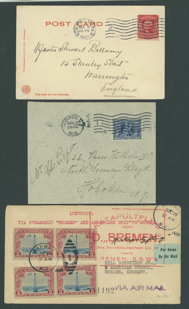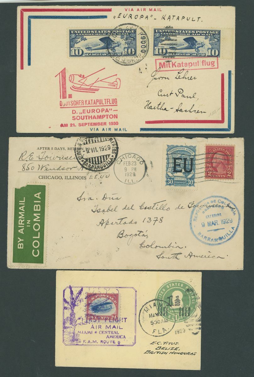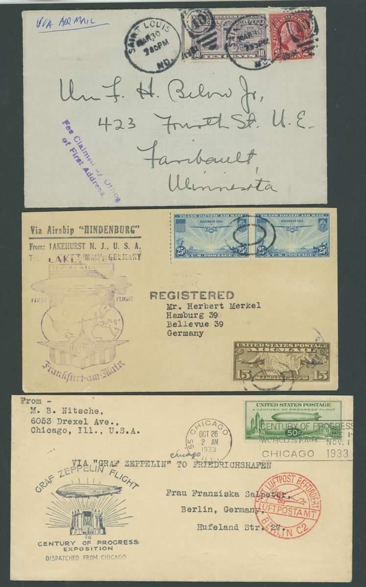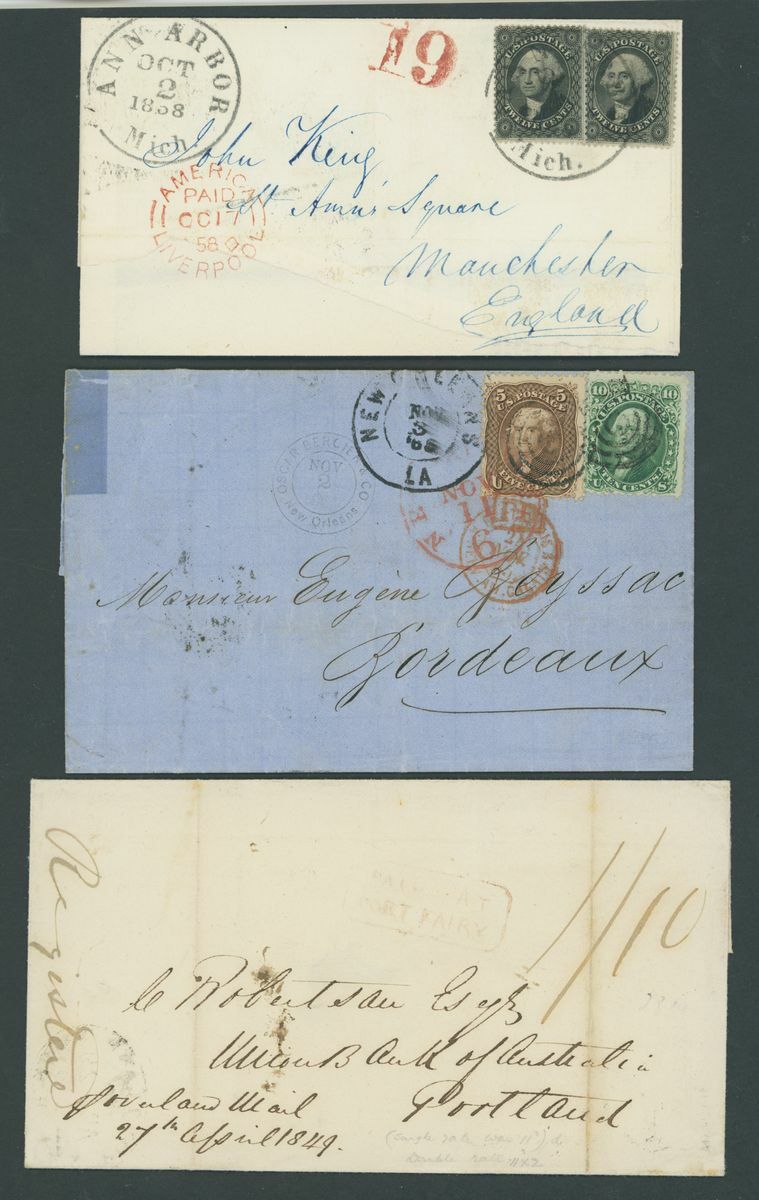 1849-1956. selection of twenty-two covers and cards, including 1858 entire (no side flaps) to Manchester franked 1857-81 12c.(2), 1865 entire from New Orleans to Bordeaux franked1861-62 5c. and 10c., Wells Fargo 3c. postal stationery envelope to British Colombia, 1901 Pan American 2c. on p.p.c. to Denmark, 5c. on p.p.c. to Stockholm, 1928 cover to German franked 1928 Air 5c. (4) with D. Bremen catapult cachet, 1929 small 1½c. on 1c. postal stationery envelope to Belize additionally franked 1918 Air 24c., 1929 SCADTA cover, 1933 Century of Progress 50c. on Zeppelin cover, etc., chiefly good to fine