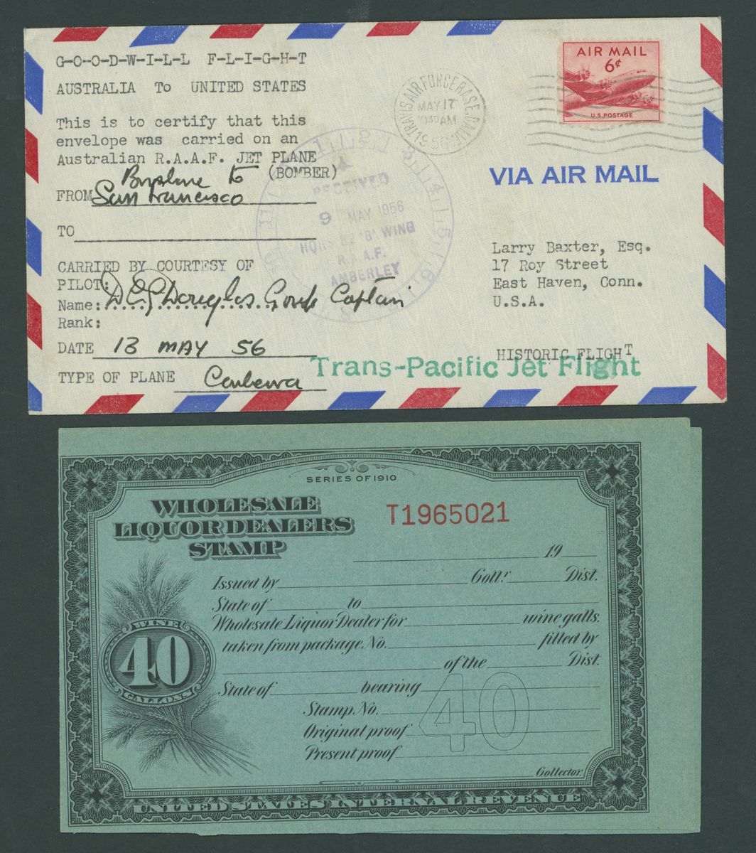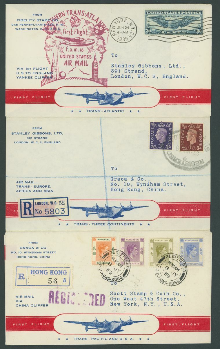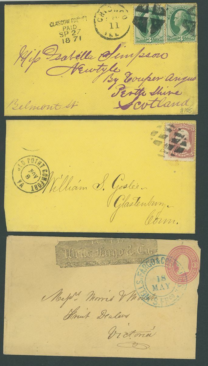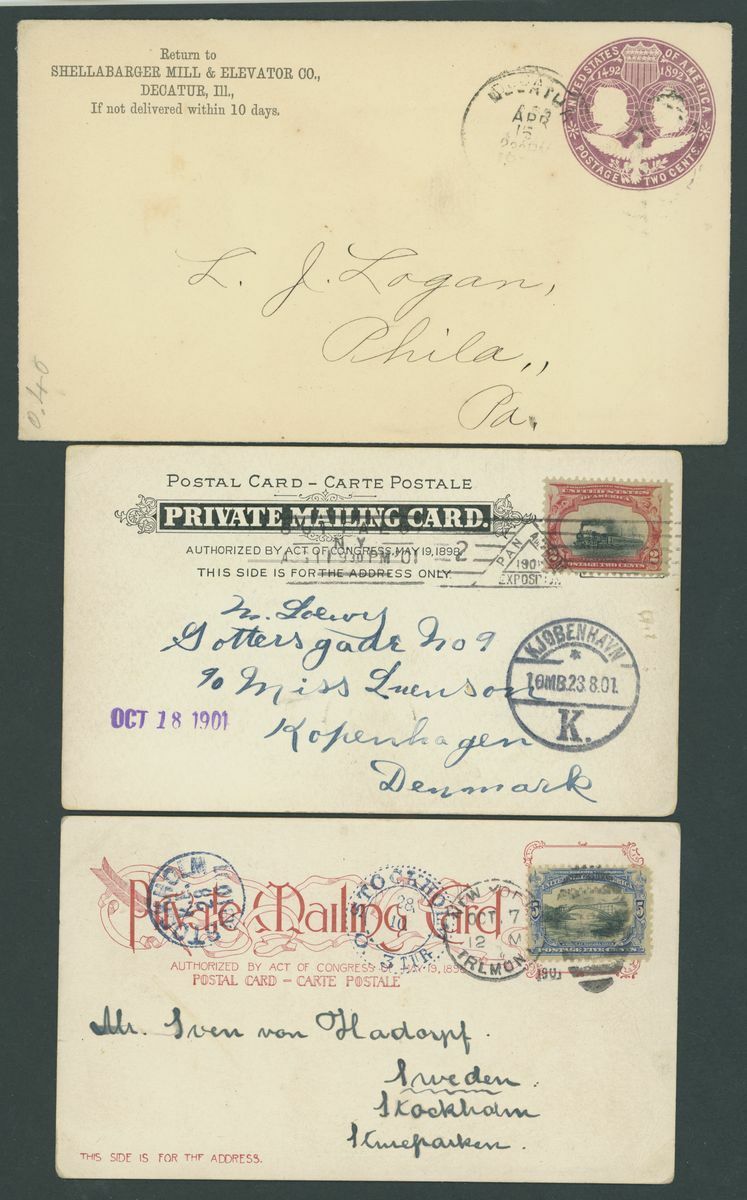 1849-1956. selection of twenty-two covers and cards, including 1858 entire (no side flaps) to Manchester franked 1857-81 12c.(2), 1865 entire from New Orleans to Bordeaux franked1861-62 5c. and 10c., Wells Fargo 3c. postal stationery envelope to British Colombia, 1901 Pan American 2c. on p.p.c. to Denmark, 5c. on p.p.c. to Stockholm, 1928 cover to German franked 1928 Air 5c. (4) with D. Bremen catapult cachet, 1929 small 1½c. on 1c. postal stationery envelope to Belize additionally franked 1918 Air 24c., 1929 SCADTA cover, 1933 Century of Progress 50c. on Zeppelin cover, etc., chiefly good to fine