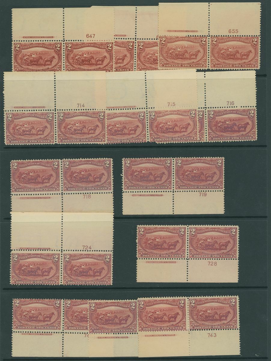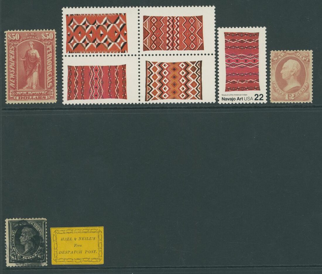Selection, 166 stamps on pages and stockcards, including 1895-97 Newspaper $50, 1898 Omaha 2c. (13 imprint and Plate number pairs), 1912-13 Parcel Post set, large part original gum, 1986 Navajo Art 22c. block of four with black (values and inscription) omitted, precancels, etc., chiefly good to fine