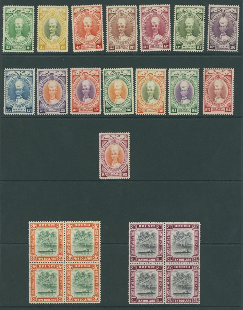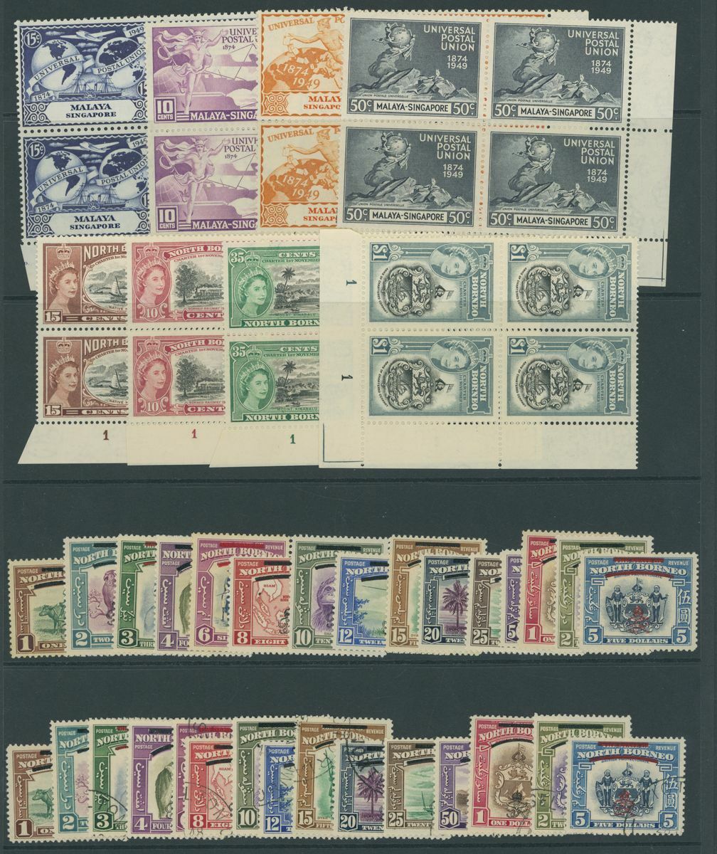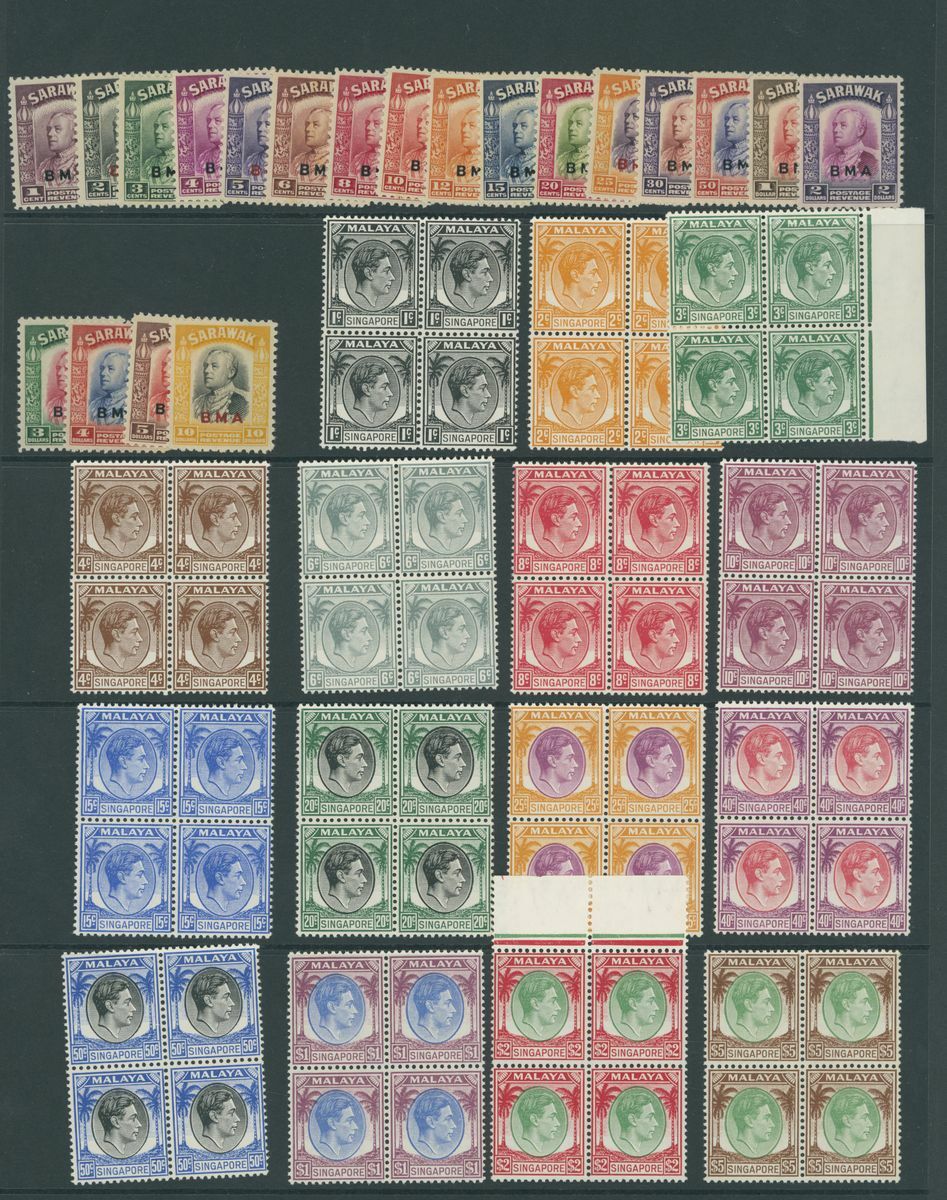 British Commonwealth South-East Asia collection on hagner pages (13), mostly mint and with complete sets including Brunei 1895 to $1, 1906 to $1 on 8c., 1907 to $1, 1924 set to $1, 1947 $5 and $10 blocks of four, Papua 1932-40 sets to £1 mint and used; Malaya Straits Settlements 1936-37 set to $5; BMA Malaya 1946 registered cover to Singapore bearing 25c., $1 and $5, Malaya Kelantan 1937 set to $5 mint, Singapore 1948 Perf 14 set to $5 in blocks of four and singles, Perf 17½x18 to $5, 1948 Silver Wedding sets mint and used, 1955 set to $5 in blocks of four and singles, 1962 set to $5 in blocks of four and singles, 1968-73 set of fifteen to $10, North Borneo 1916 optd type b set to 25c. unused and 25c. on cover to Sandakan, 1931 sets to £5 mint and used, 1939 set to $5, BMA 1945 to £5 mint, also $5 block of four used, BMA 1947 to $5 in blocks of four mint, also full sets mint and used, 1950 to $10 mint and used, 1956 set in marginal blocks of four showing sheet number, 1939 postage due to 10c. in marginal blocks of four; Sarawak BMA 1945 set to $10 mint and used set to $10 tied to pieces (4), generally fine and with many unmounted examples, a useful collection with high catalogue value (S.G. £13,000+)