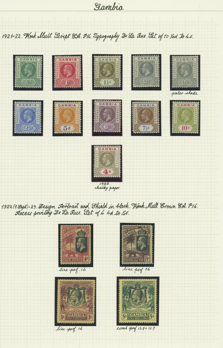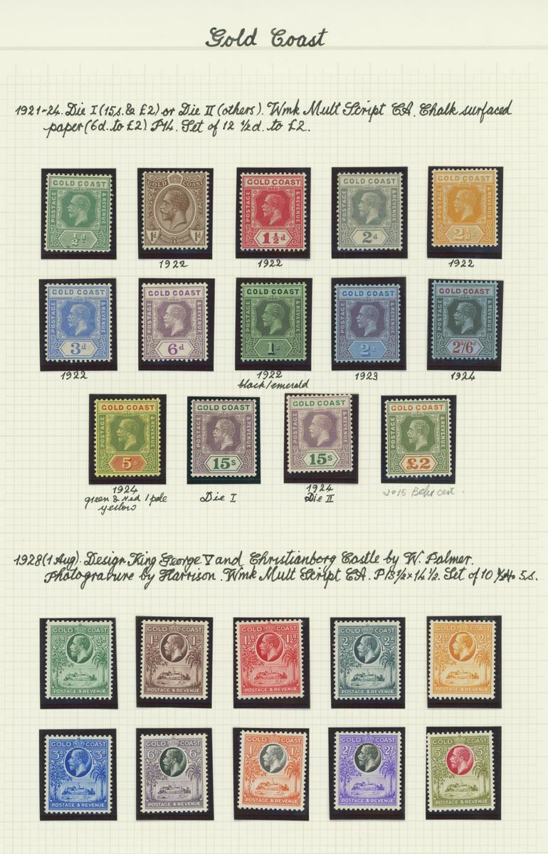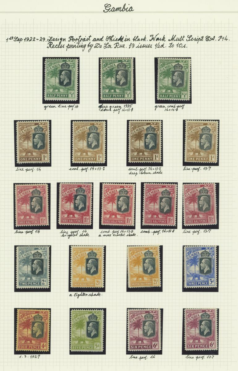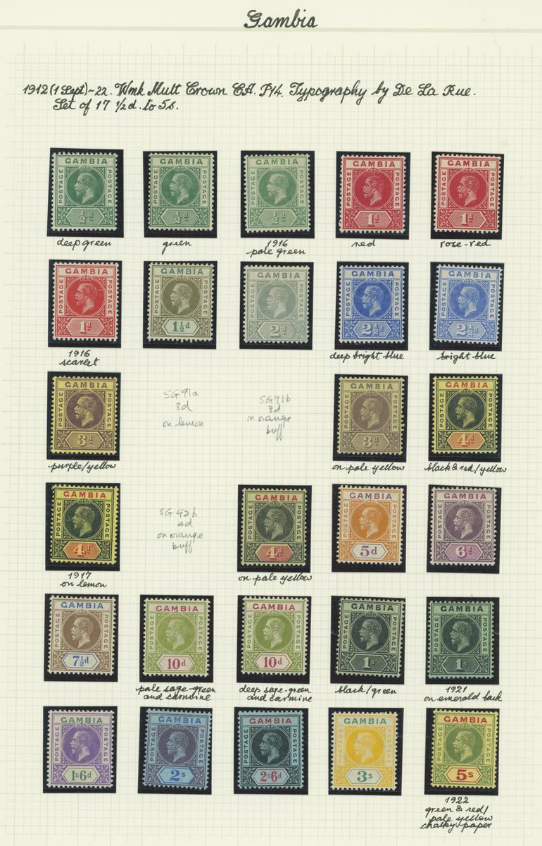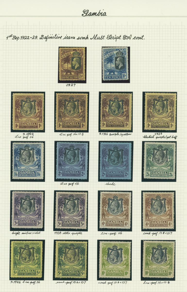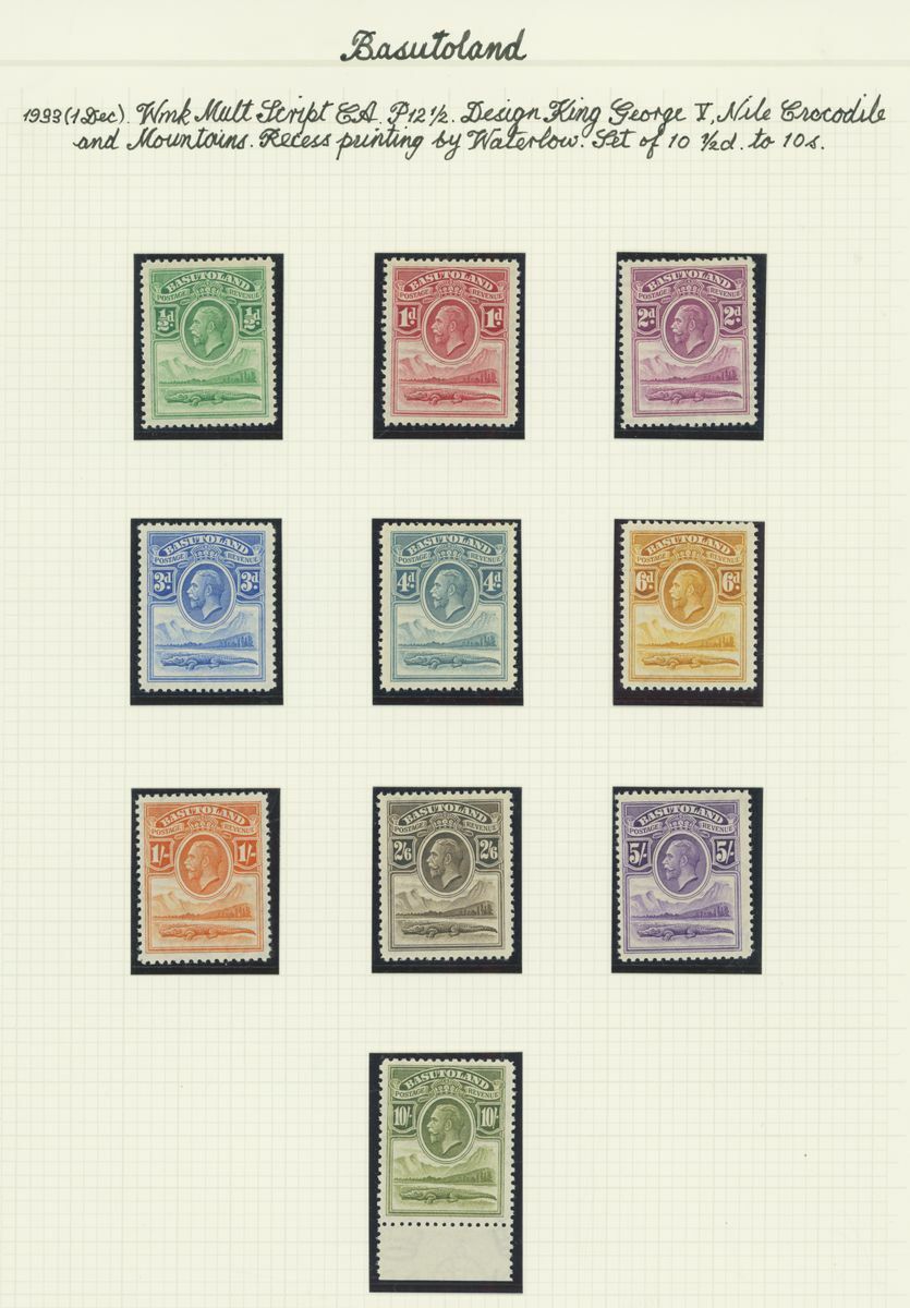 A mint KGV British Africa collection on album pages with Basutoland 1933 set to 10/-, Bechuanaland 1932 set to 10/-, Gambia with 1912 set to 5/-, 1921-22 set to 4/- and 1922-29 set to 10/- with a range of shades, Gold Coast with 1913-21 set to 20/- and with shades, 1921 Script set to £2 and 1928 set to 5/-, Northern Rhodesia 1925-29 set to 20/-, Nyasaland 1913 MCA set to £1, 1921-33 Script set to 10/- and 1934 set to 1/- Somaliland with 1912-19 MCA set to 5r. and 1921 Script set to 5r., South Africa 1913-24 set to £1 with shades, Southern Rhodesia 1924-29 set to 5/- and 1931-37 set to 5/- and Swaziland 1933 set to 10/-; good to fine mint. S.G. cat. value in excess of £7,000