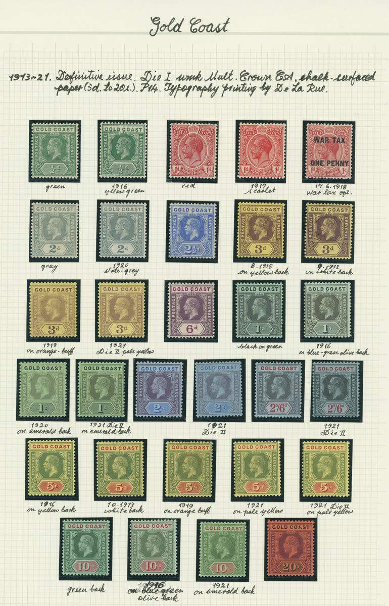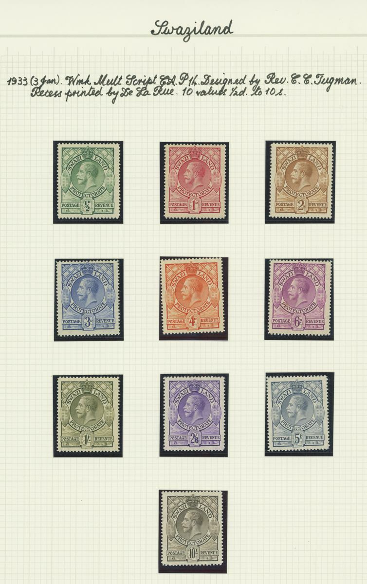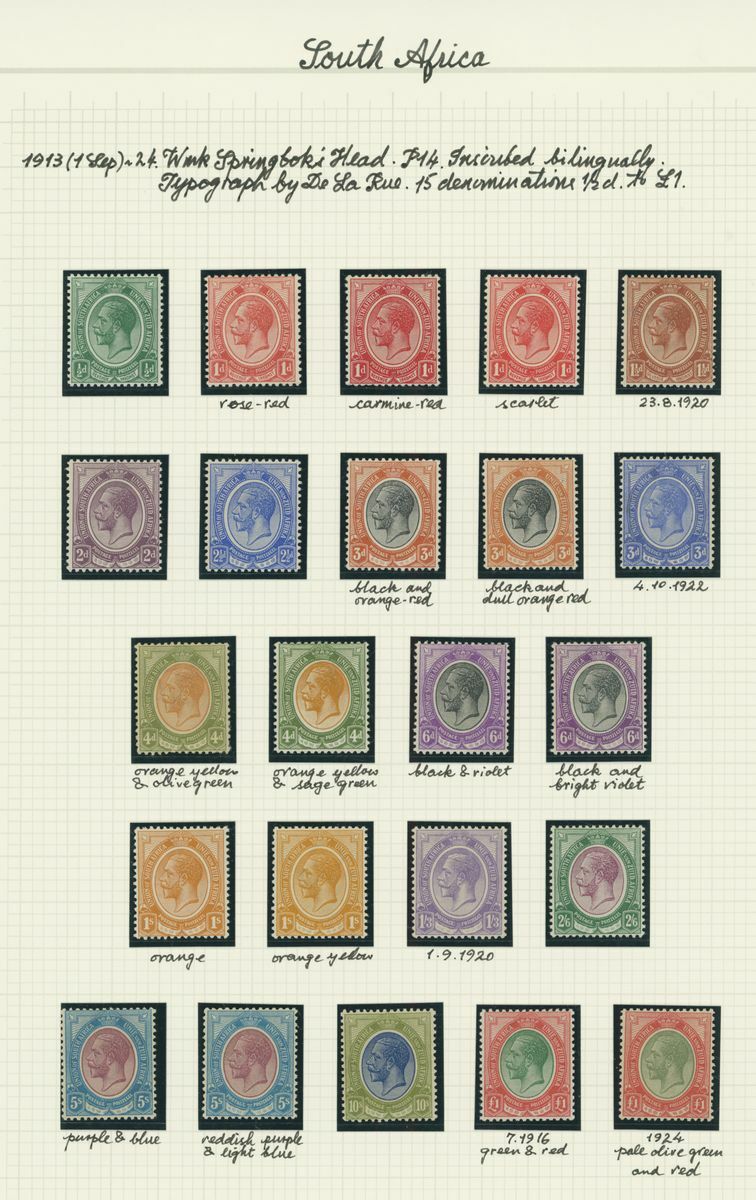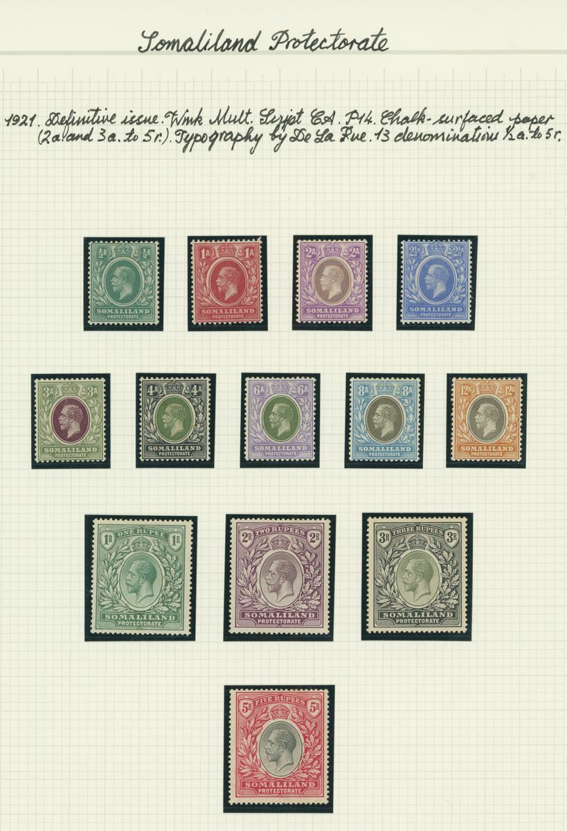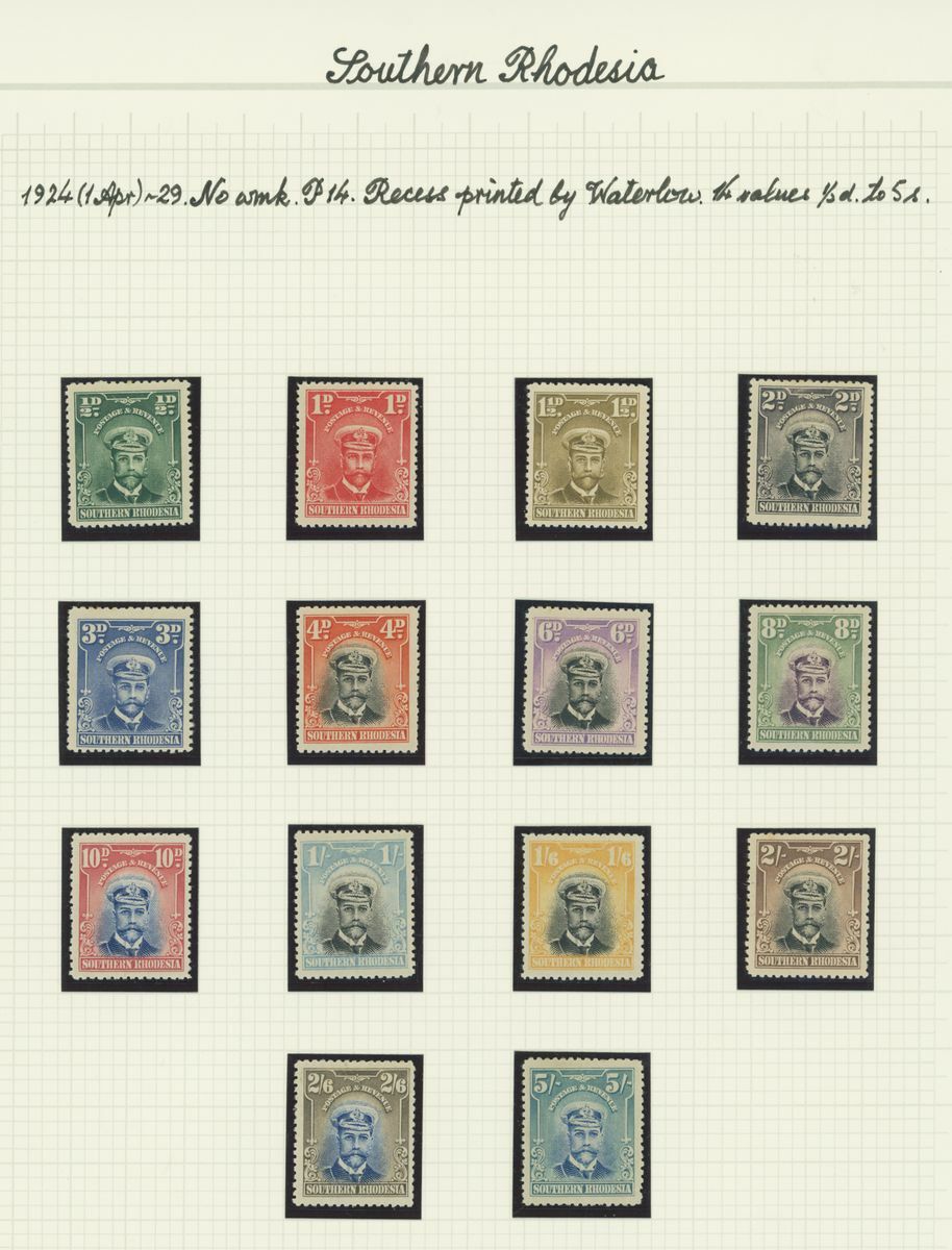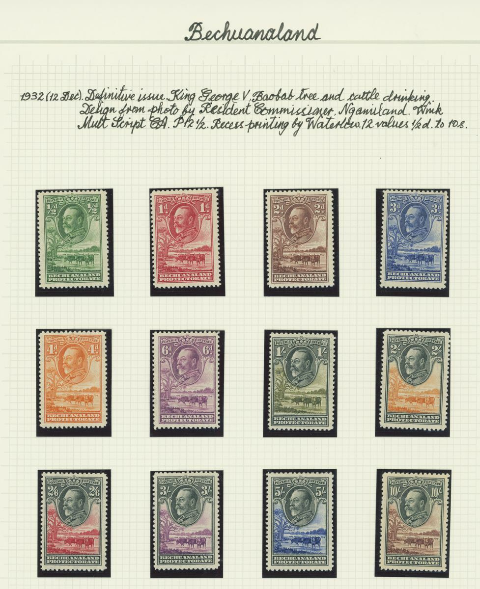 A mint KGV British Africa collection on album pages with Basutoland 1933 set to 10/-, Bechuanaland 1932 set to 10/-, Gambia with 1912 set to 5/-, 1921-22 set to 4/- and 1922-29 set to 10/- with a range of shades, Gold Coast with 1913-21 set to 20/- and with shades, 1921 Script set to £2 and 1928 set to 5/-, Northern Rhodesia 1925-29 set to 20/-, Nyasaland 1913 MCA set to £1, 1921-33 Script set to 10/- and 1934 set to 1/- Somaliland with 1912-19 MCA set to 5r. and 1921 Script set to 5r., South Africa 1913-24 set to £1 with shades, Southern Rhodesia 1924-29 set to 5/- and 1931-37 set to 5/- and Swaziland 1933 set to 10/-; good to fine mint. S.G. cat. value in excess of £7,000