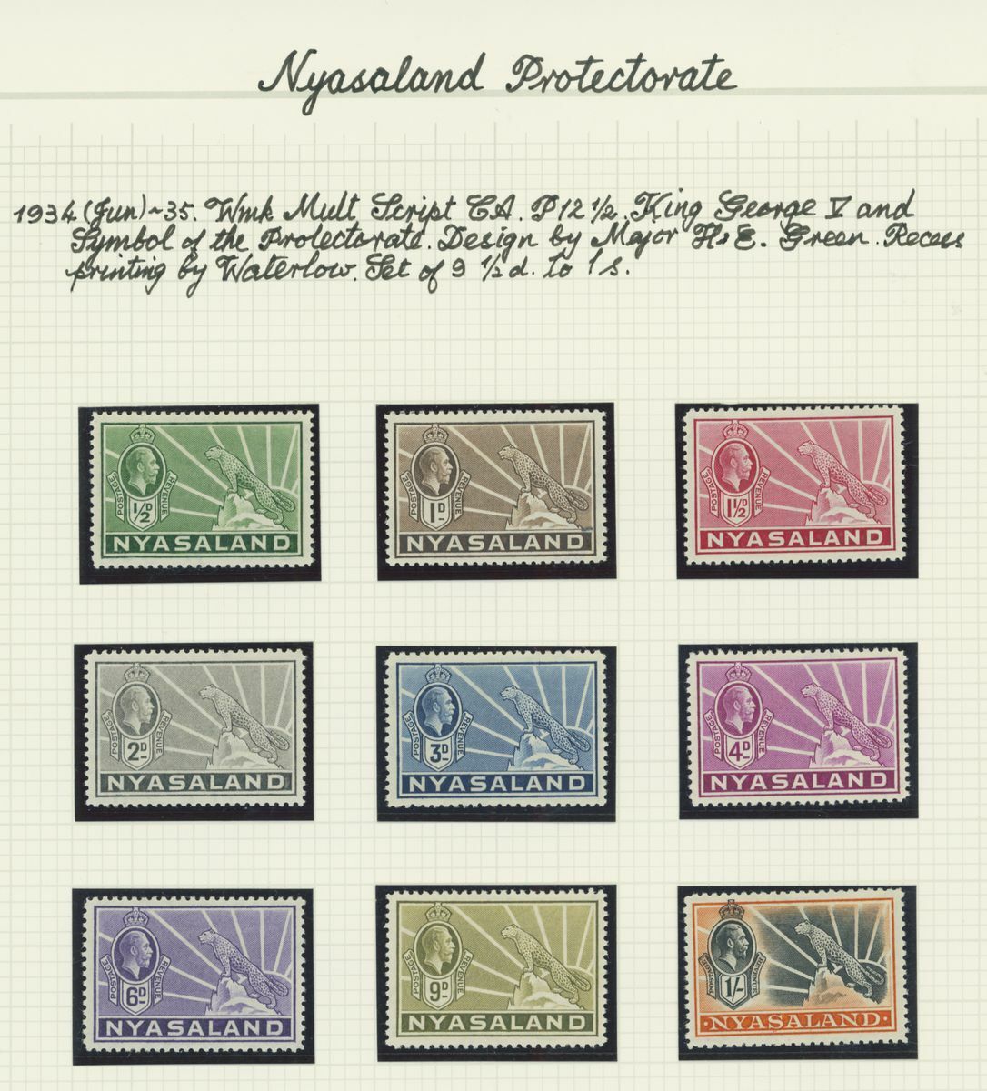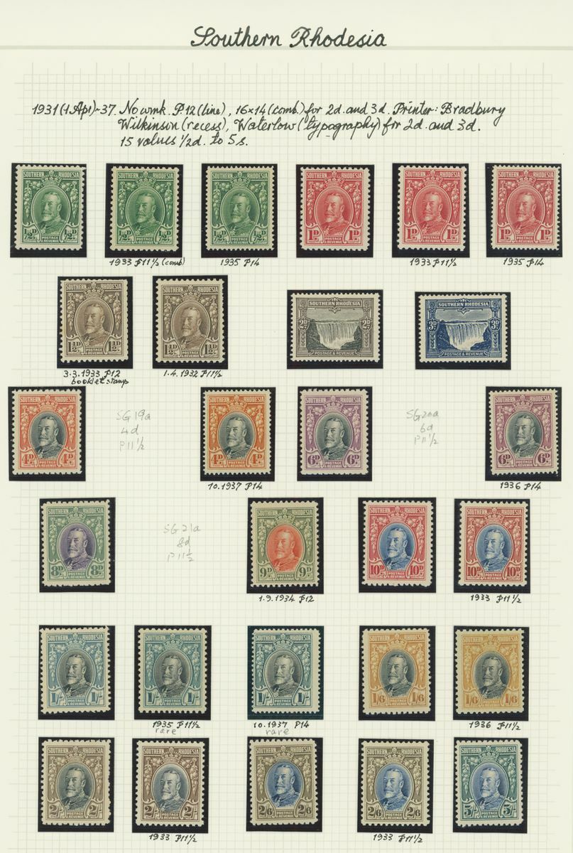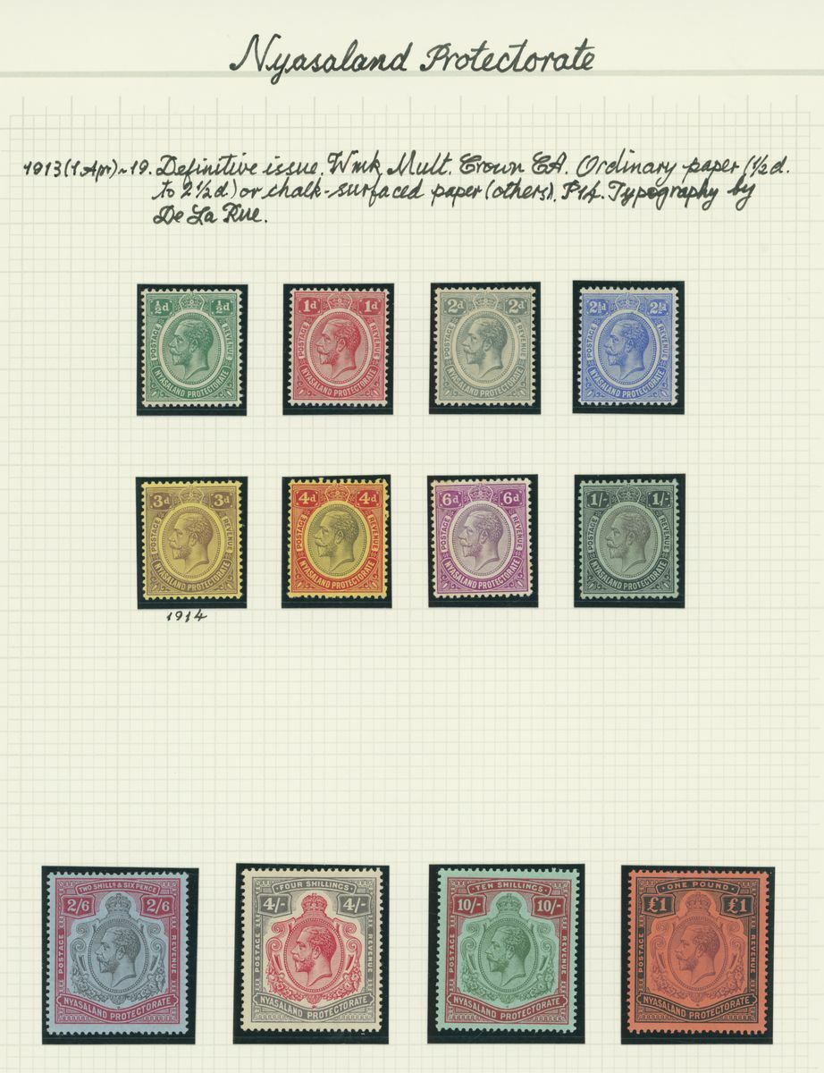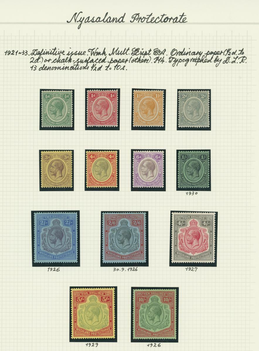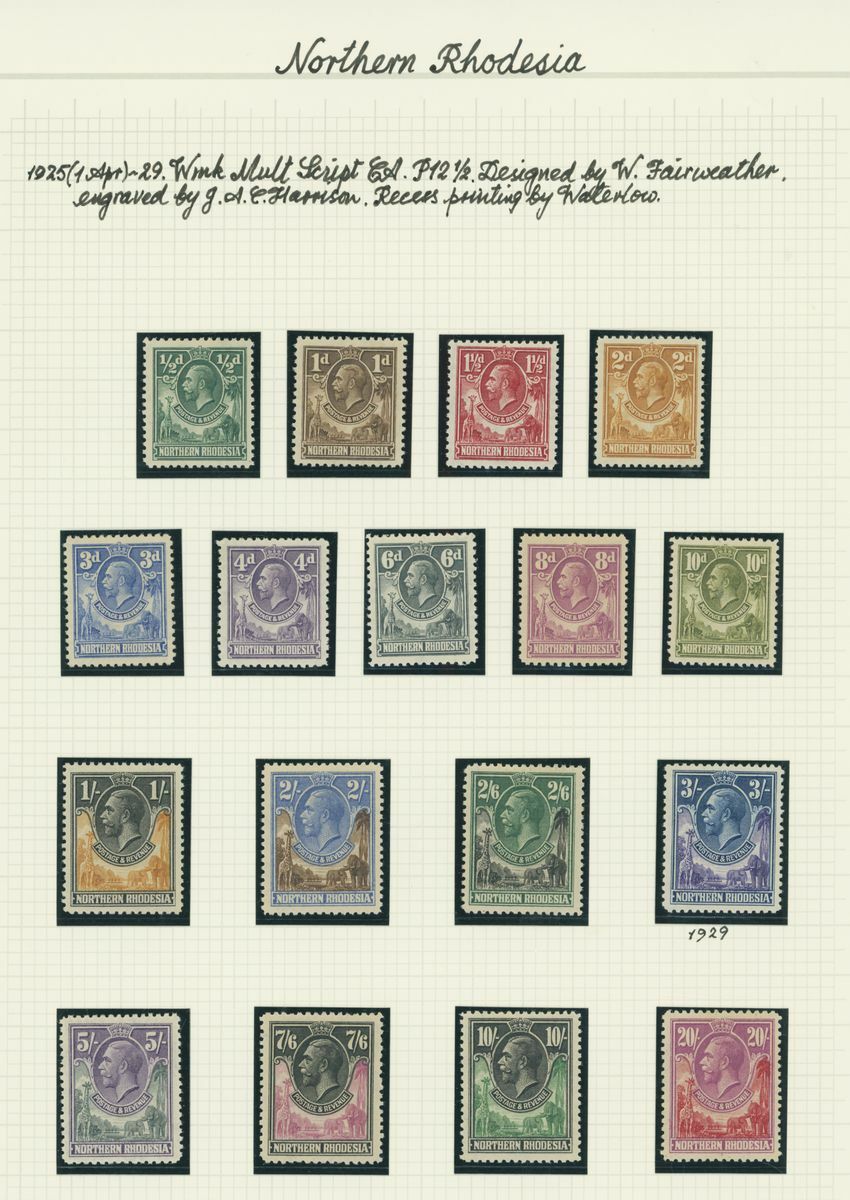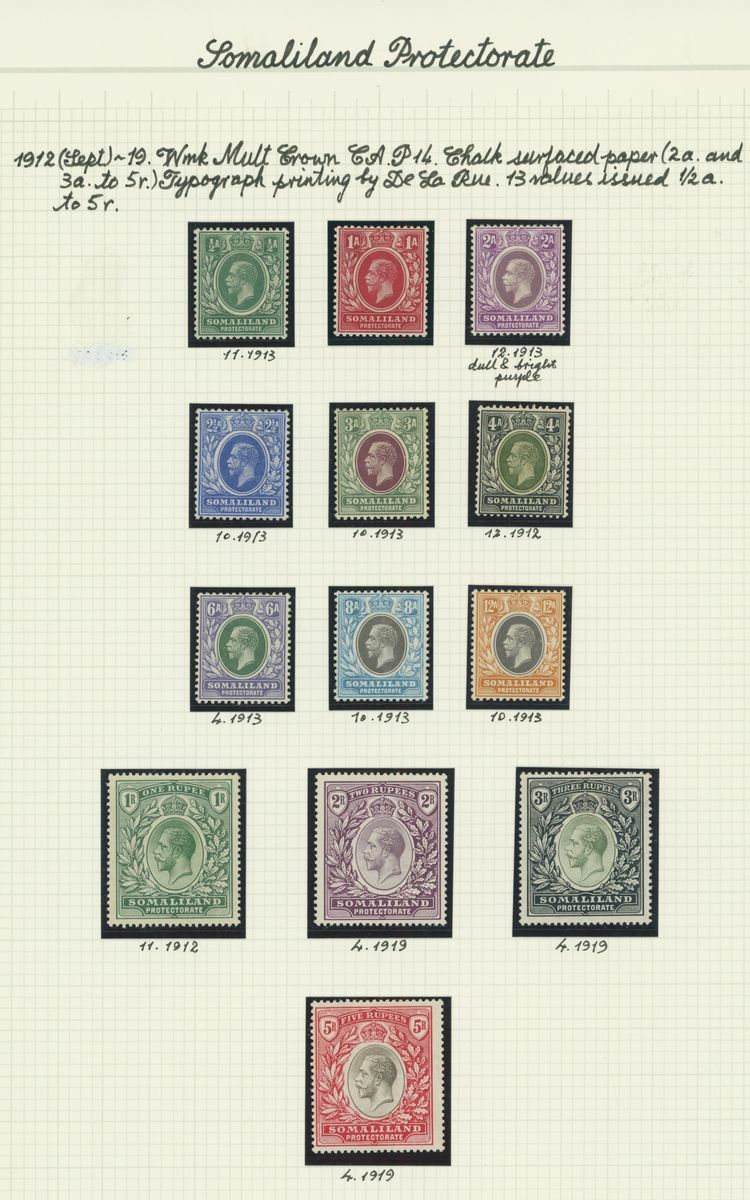 A mint KGV British Africa collection on album pages with Basutoland 1933 set to 10/-, Bechuanaland 1932 set to 10/-, Gambia with 1912 set to 5/-, 1921-22 set to 4/- and 1922-29 set to 10/- with a range of shades, Gold Coast with 1913-21 set to 20/- and with shades, 1921 Script set to £2 and 1928 set to 5/-, Northern Rhodesia 1925-29 set to 20/-, Nyasaland 1913 MCA set to £1, 1921-33 Script set to 10/- and 1934 set to 1/- Somaliland with 1912-19 MCA set to 5r. and 1921 Script set to 5r., South Africa 1913-24 set to £1 with shades, Southern Rhodesia 1924-29 set to 5/- and 1931-37 set to 5/- and Swaziland 1933 set to 10/-; good to fine mint. S.G. cat. value in excess of £7,000